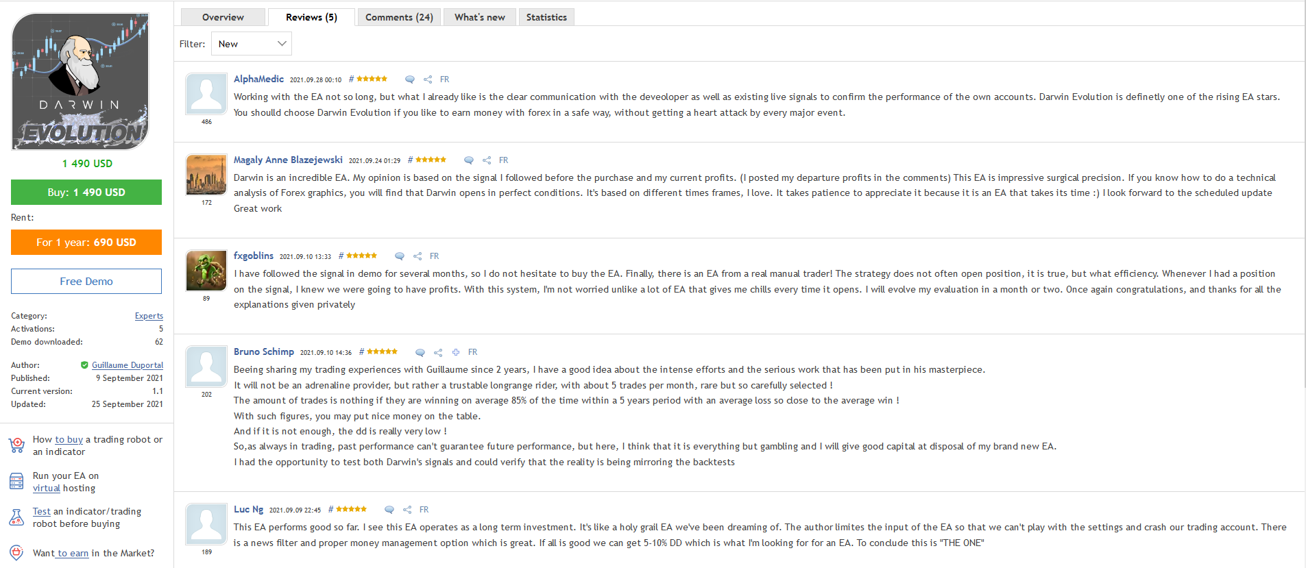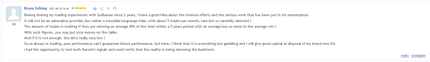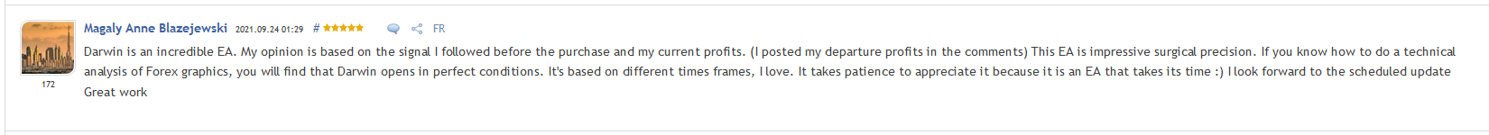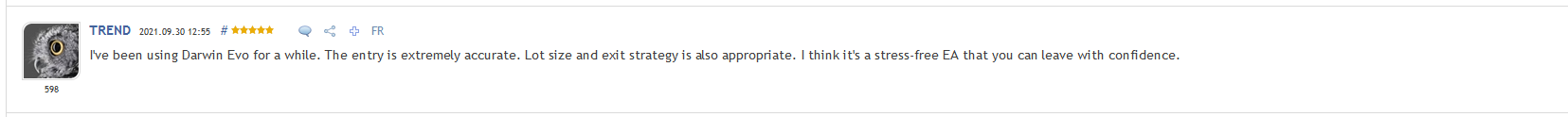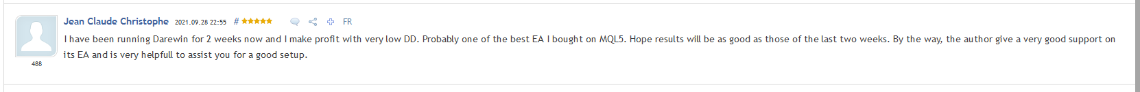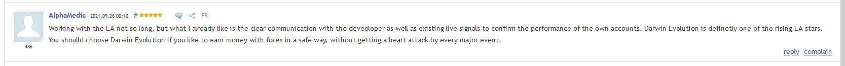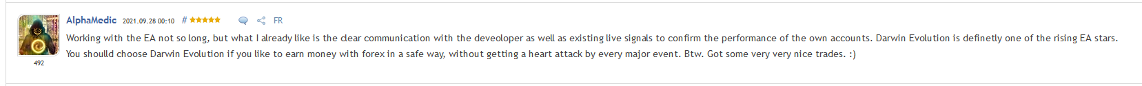 Working with the EA not so long, but what I already like is the clear communication with the deveoloper as well as existing live signals to confirm the performance of the own accounts. Darwin Evolution is definetly one of the rising EA stars. You shoulld choose Darwin Evolution if you like to earn money with forex in a safe way, without getting a heart attack by every major event.