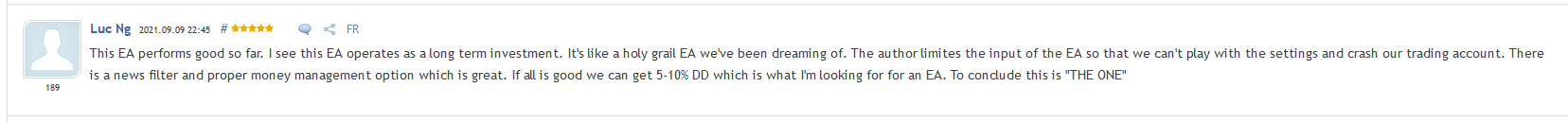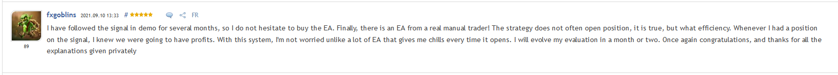 "" I have followed the signal in demo for several months, so I do not hesitate to buy the EA. Finally, there is an EA from a real manual trader! The strategy does not often open position, it is true, but what efficiency. Whenever I had a position on the signal, I knew we were going to have profits. With this system, I'm not worried unlike a lot of EA that gives me chills every time it opens. I will evolve my evaluation in a month or two. Once again congratulations, and thanks for all the explanations given privately""I hope that MQL5 will unlock those given on the expert in the "Reviews" section