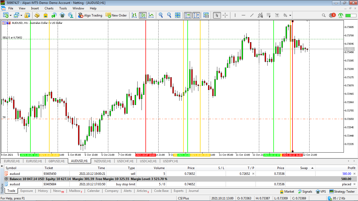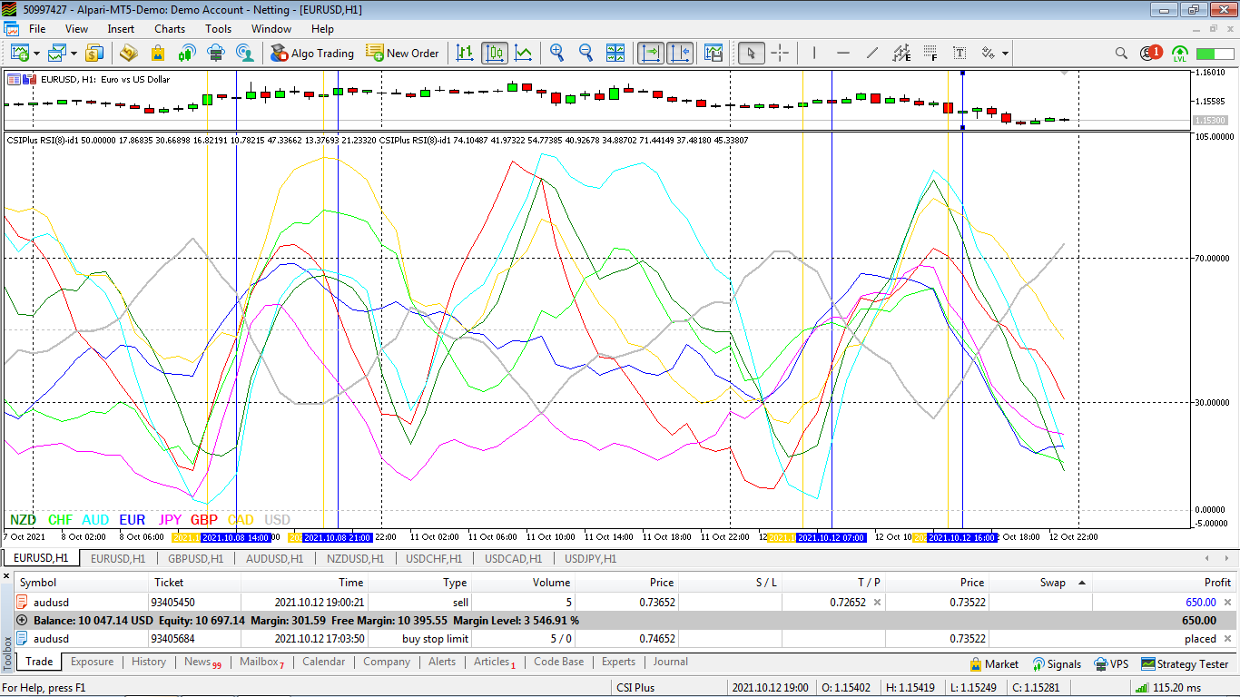 A deal to sell AUDUSD on a trading system based on the signals of the Currency Strength Index Plus indicator.