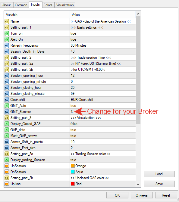Чтобы получить правильные данные, установите в параметре GMT_Summer летнее GMT смещение Сервера Брокера(котировок) в часах. Параметры Session_opening_hour и Session_closing_hour теперь менять не нужно.
