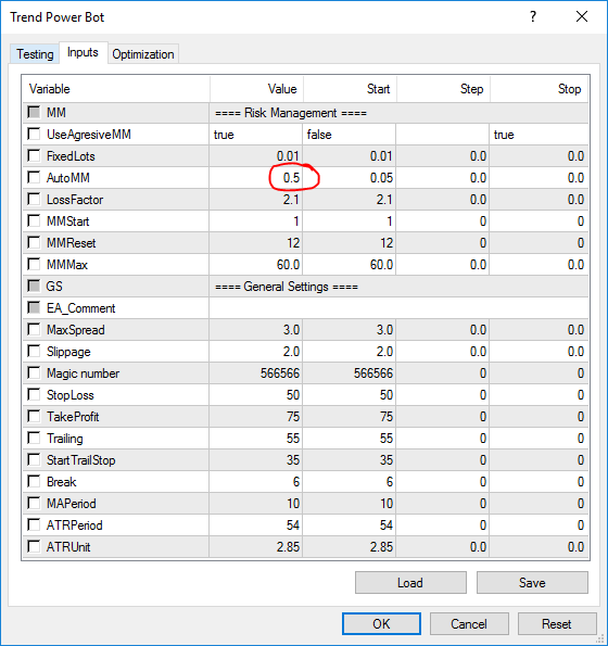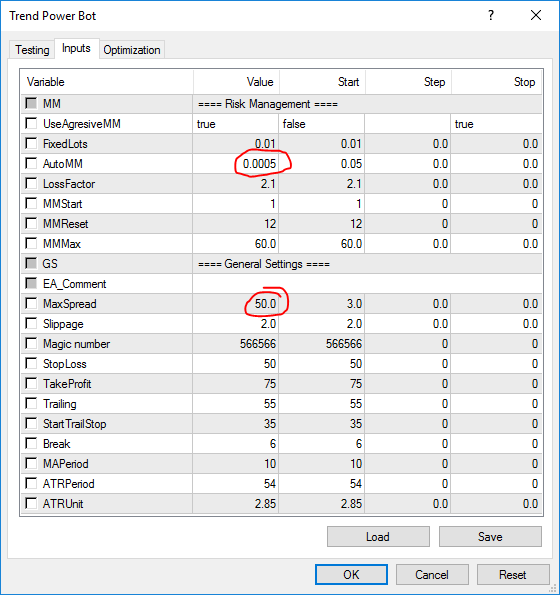 set above for gold. AutoMM so it get 0.05, same as previous test. higher max spread so that EA can open order
