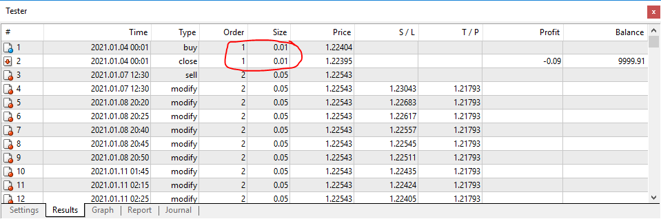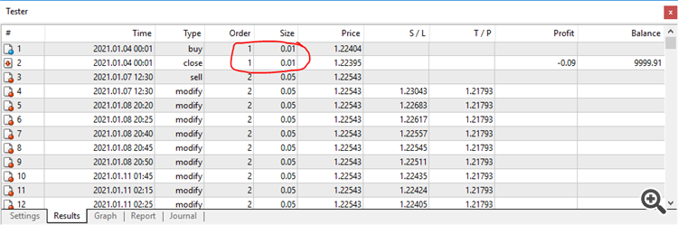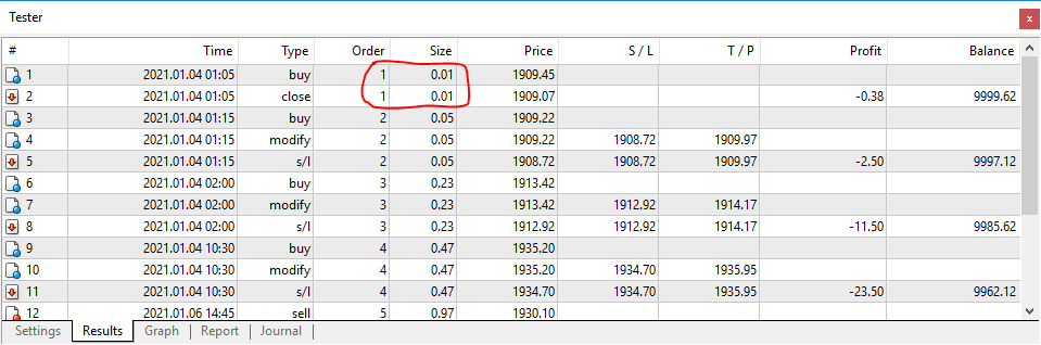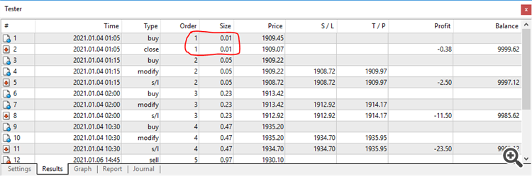 Hi, It is normal that you get 0.01 for the first trade because it is a test order. As you can see the EA closes the trade immediately. It is for testing purpose.