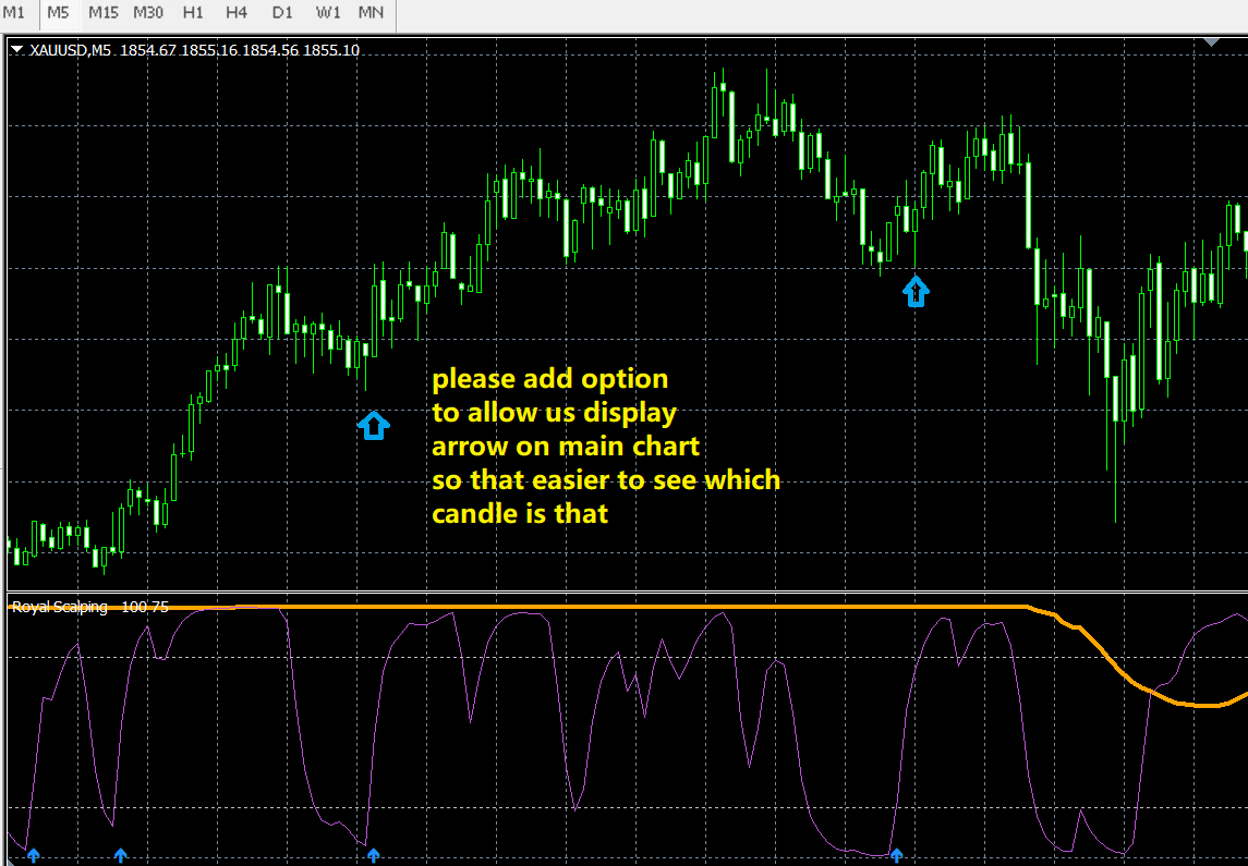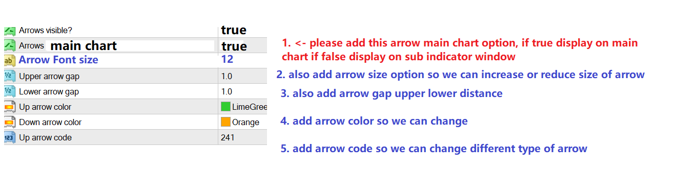 Dear Author please kindly make enhancement to the arrow above, please make ok the 5 item above ok? currently the arrow in subwindow is hard to see which candle is that, please add an option to allow us display arrow in Main Window, and also add above item 2,3,4,5 to allow us change the distance, color, size and type of arrow code, Thank you very much.
