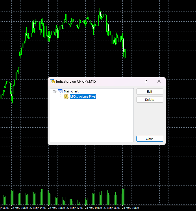 Upon confirmation that my purchase was OK, I installed it, refreshed the navigator, and I added it to a chart as a complement to my other usual indicators.