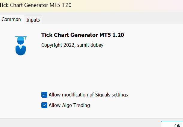 I tried deleting it and reinstalling both the Tick generator and the tick chart monitor, but I don't know can't find the cause. All the boxes are checked/ticked, the Algo Trading button is checked/"Live" but there's no movement on the candles on the "tick.M1" chart. All the other charts are behaving normally.