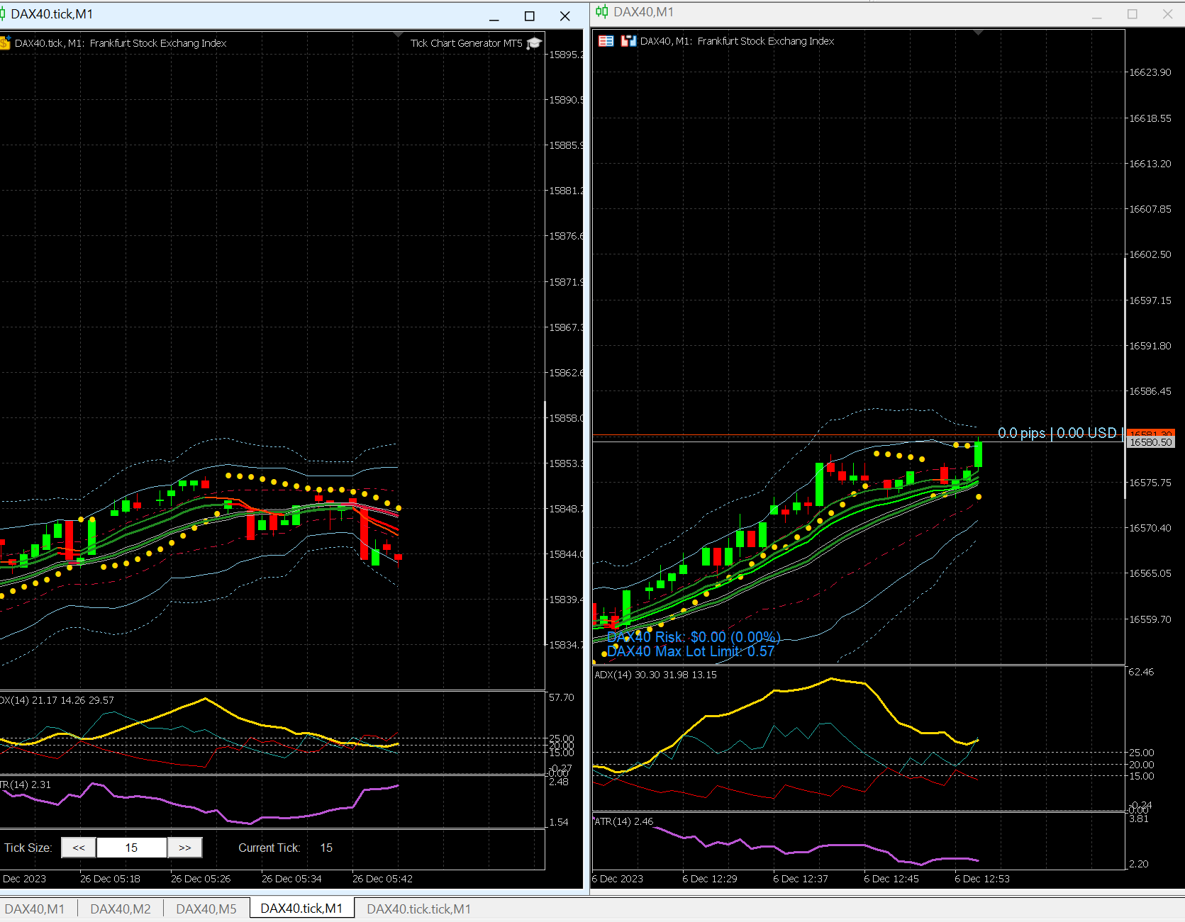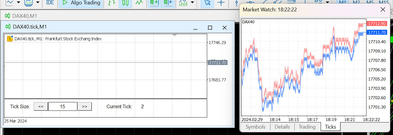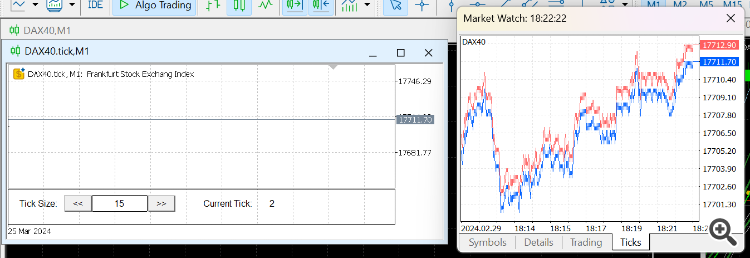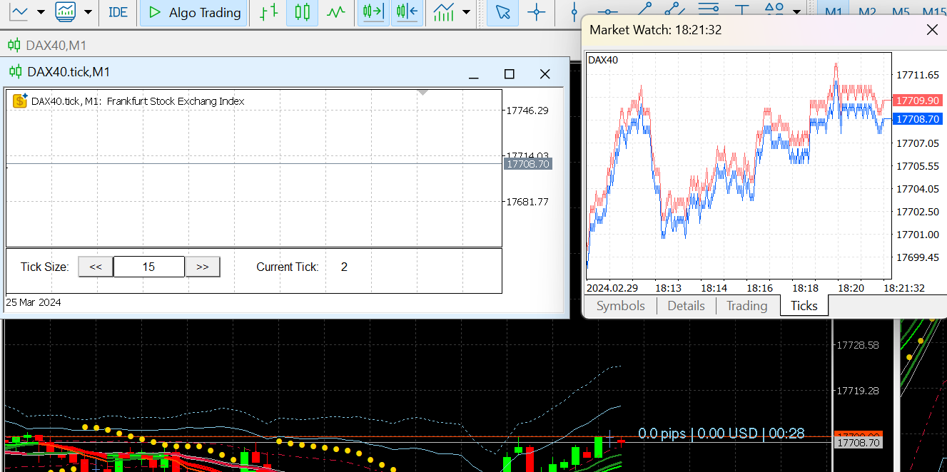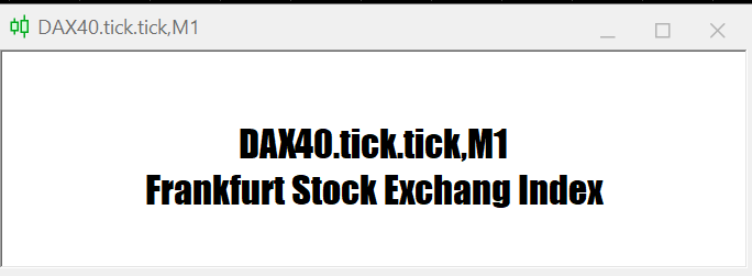 I noticed after waiting for about 10 mins occasionally a "Bid Price Line" appeared matching the Bid Price Line on the "Market Watch" Tick Chart. The Tick Chart monitor only had advanced to a count of 1 even though the line had appeared a few times ... maybe once every 20 secs? I adjusted/increased the scale on the DAX.tick.M1 chart and the Bid Price line stayed consistently so clearly "some" information is being sent by the Tick Chart Generator to it's generated "DAX.tick.M1" chart, but no candles ... no anything ... and a recorded 2 ticks over what has been 20+ mins.