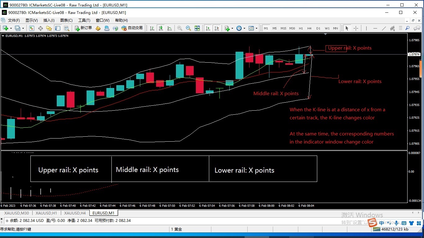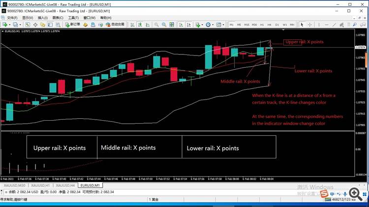 2. At the same time, display the number of points between the K-line and each trajectory in the indicator window. For example, list the upper, middle, and lower orbit tables, and mark the number of points between the K-line and trajectory in each grid. At the same time, the specified number of points will also change color, synchronized with the color change of the K line.