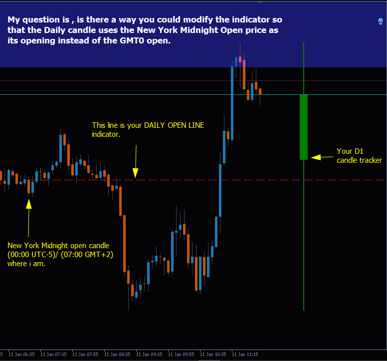 I was wondering if you could make modifications to the indicator or add a feature where we could use the NEW YORK Midnight open price/time as the Daily candle tracker open price/time instead of the GMT0 time that is being used (indices use 01:05 GMT+2 where i am)..