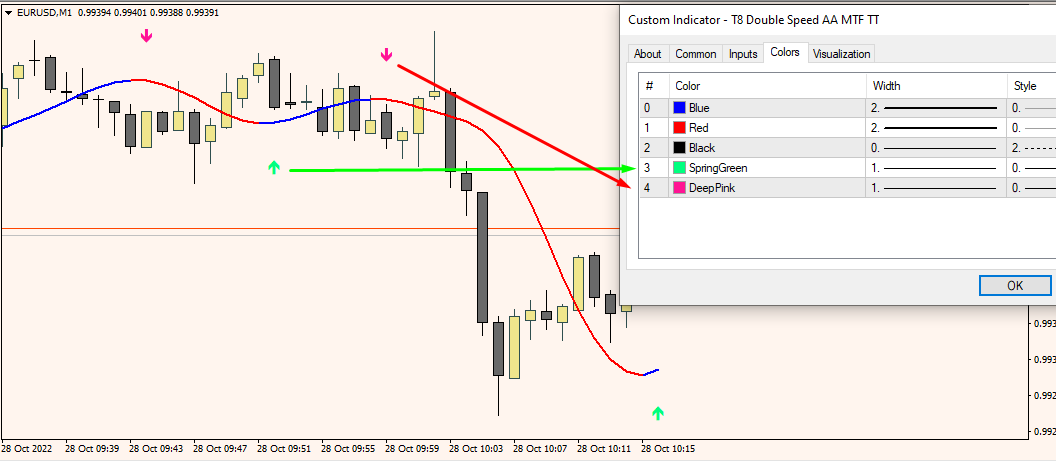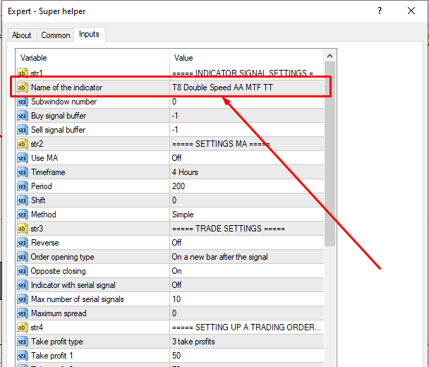 2. Enter the exact name of the indicator in the Expert Advisor settings, in my case it is T8 Double Speed AA MTF TT, you enter your indicator name.