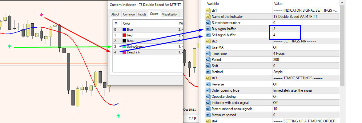 3. Enter the buffer numbers of the buy and sell arrows of the indicator in the EA settings.