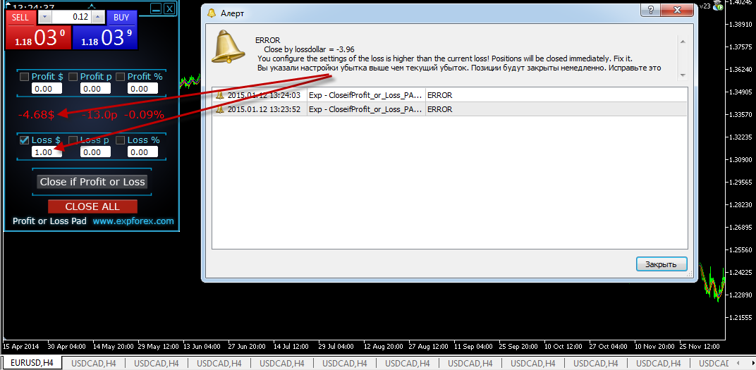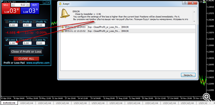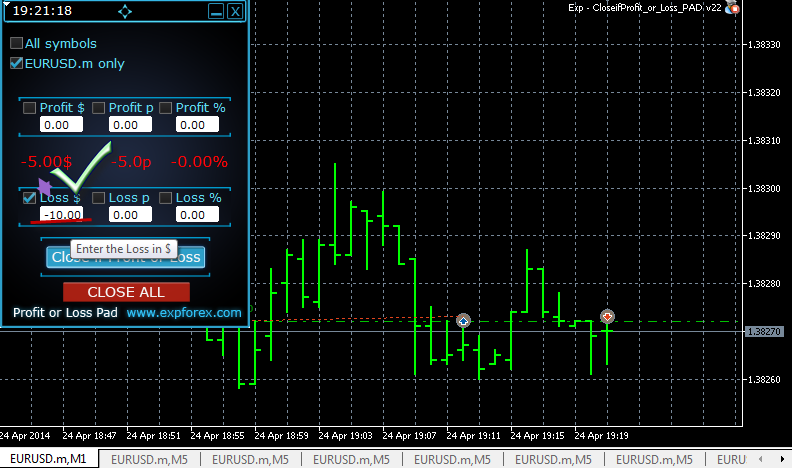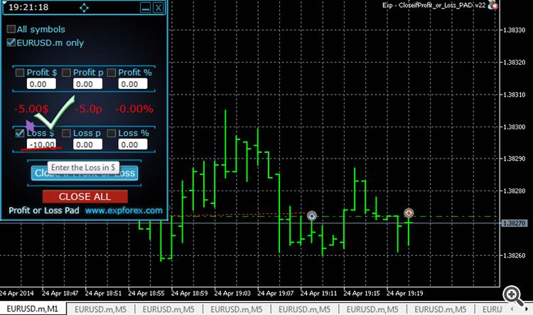 Новая вкладка Close if Profit or Loss позволяет закрывать позицию по символу/всем символам, если выполнилось условие по достижению общей прибыли или убытка в долларах, пипсах или процентах.