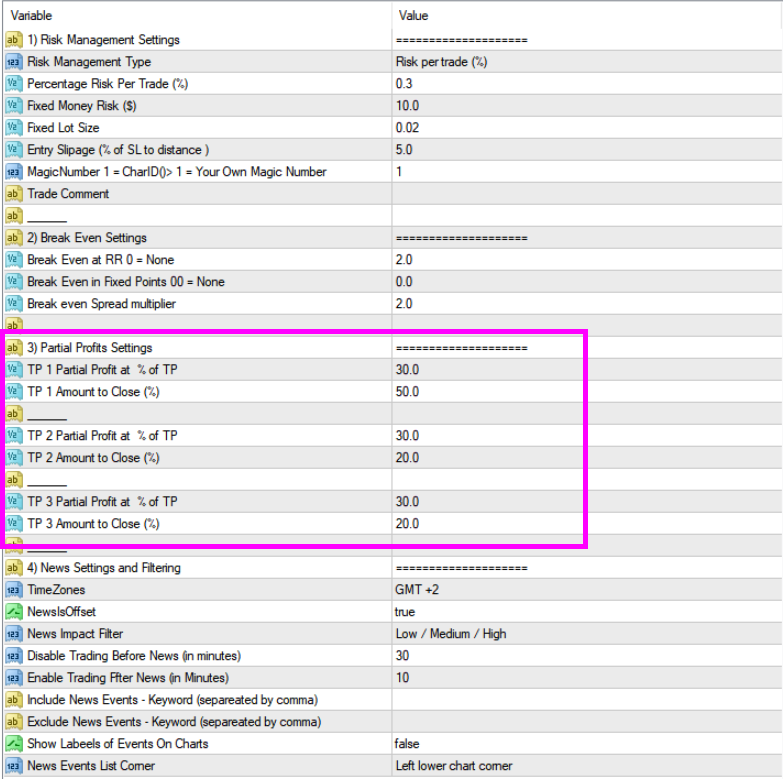 You will set % of TP and amount you want to close. There will not be set 3 TP, but EA will close these partials profits as the price moves