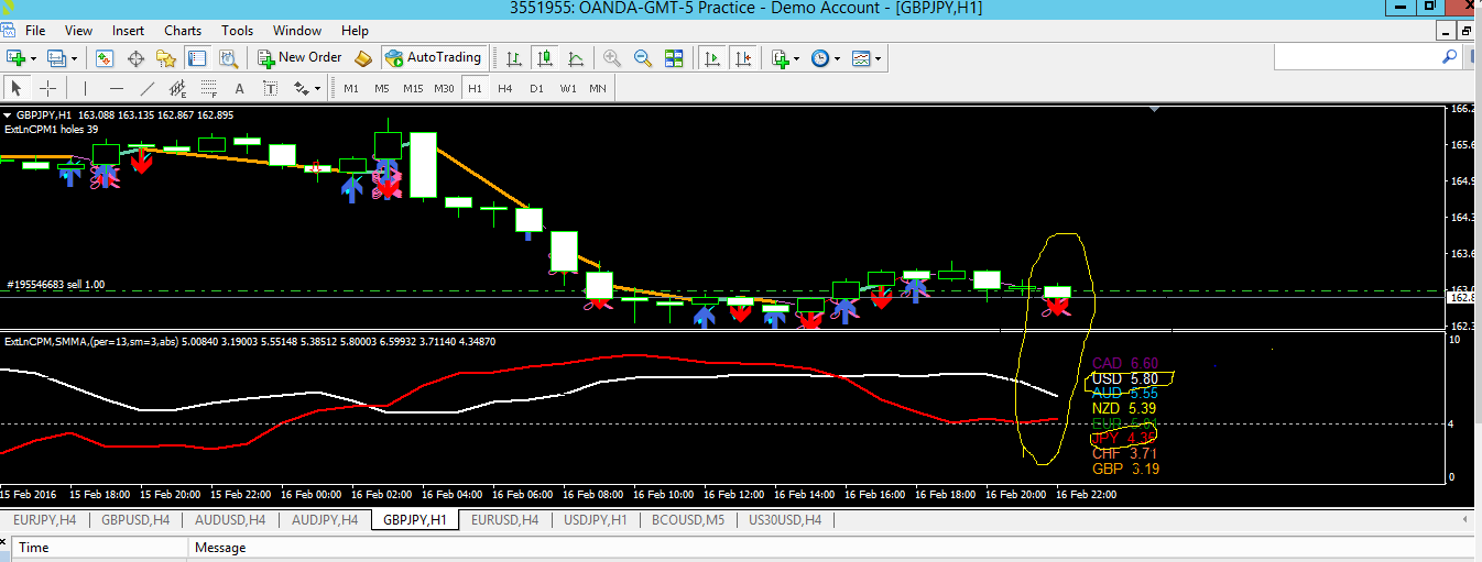 If I trade for example GBP/AUD and set cpm to only show those two currencies on the chart, (in this case wihtout running linear indi)