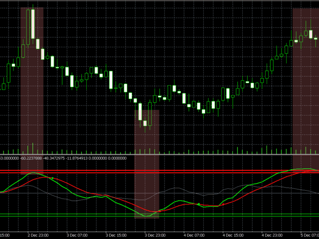 When the oscillator is above the overbought band (red lines) and crosses down the signal (dotted line), it is usually a good SELL signal. Similarly, when the oscillator crosses above the signal when below the Oversold band (green lines), it is a good BUY signal.