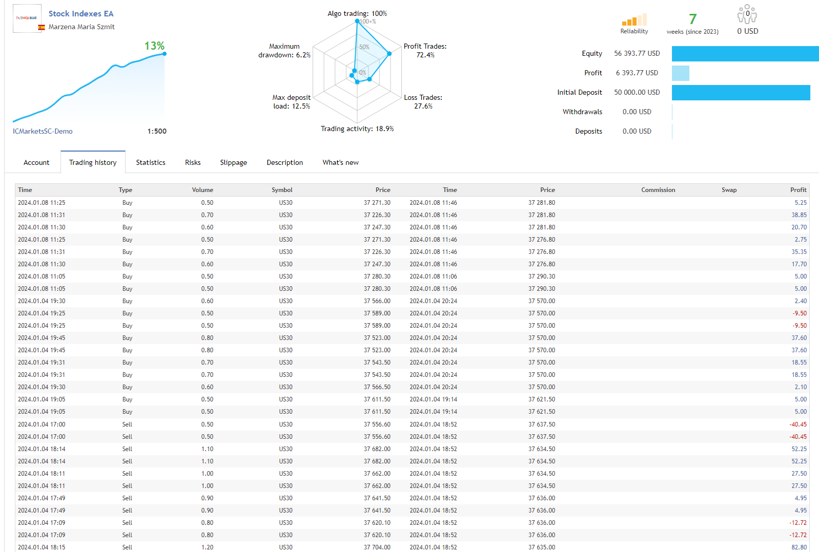 Stock Indexes EA is a sophisticated trading robot meticulously engineered to capitalize on the dynamics of the US30. This expert advisor employs advanced algorithms and technical indicators to analyze market trends, identify potential entry and exit points, and execute trades with precision. A news filter has also been added to the robot, which prevents it from opening a position during important economic news, minimizing the risk. In robot, you can also specify the days and hours when the EA should trade, we recommend setting Friday to off. You can also try this Stock Indexes EA on the DAX-GER40, we completed several tests and the results were promising. Please keep in mind that the minimum lot size for US30 with some MT4 brokers is 1.0 lots, but many MT5 brokers offer trading for US30 with 0.01 lots. We recommend checking your account before. Please send me a private message after purchasing the Stock Indexes EA, and I will give you access to the private group where you will receive support and be able to discuss about the robot.