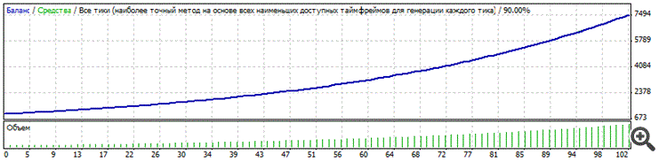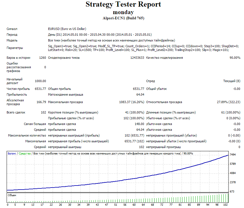 Такая картинка получается благодаря стратегии, заложенной в советник (откат цены после пятницы, берем 10 пунктов и уходим из рынка). По тестам стабильный результат с марта 2014 года по сегодняшний день. Можно воспользоваться безубытком, позиция вышла на 10 п. в плюс, выставляем стоп лосс на +1, ждем, растет дальше, хорошо, возьмем больше, цена пошла назад, закроем плюс один пункт, ждем следующего понедельника и т.д.