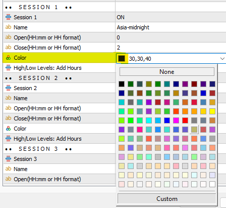 To use the sessions colors on the clock, set 'Clock: Mode'=Sessions Colors