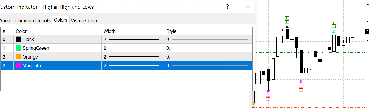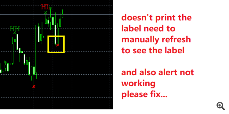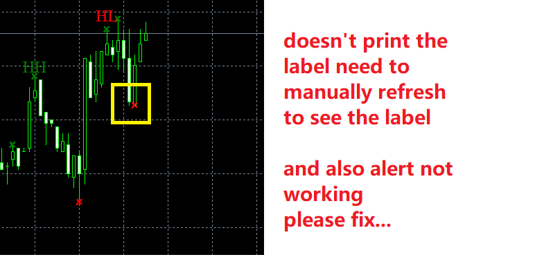 also Author please add option to allow us change the label color the HL, LH, LL, LH color I try change but not working see above, because on black background the green label will be too dim cannot see, please add option to allow user change the color of the label and symbol x also ok bro please? urgent else bought already cannot use now your indicator very sad...