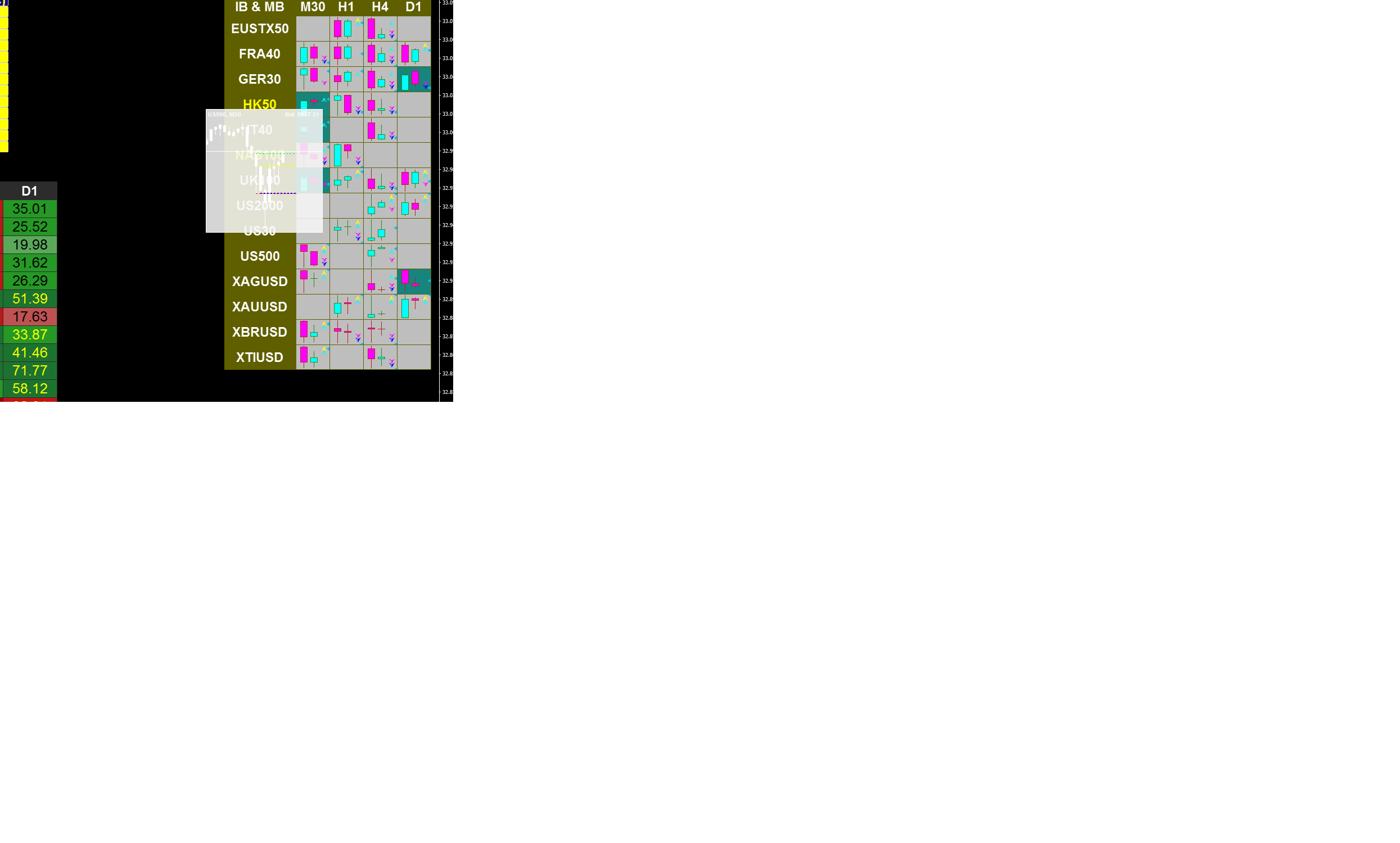 Turn on candles on the chart and they will appear in the pop-up chart of the indicator.For pop-up charts, the indicator takes colors from the main chart.