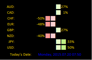 According to the rules 'Green' Bars indicate strength & 'Red' Bars indicate weakness. I start to take notice when there are >3 Bars on any currency. On the morning of the 20th, it showed USD to be the strongest currency at least in the short-term. However, since there are only 2 bars, I remain cautious.