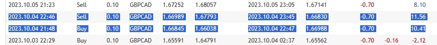 The bottom highlighted row end at 2023.10.04 22:47 and the top highlighted row end at 2023.10.04 22:46