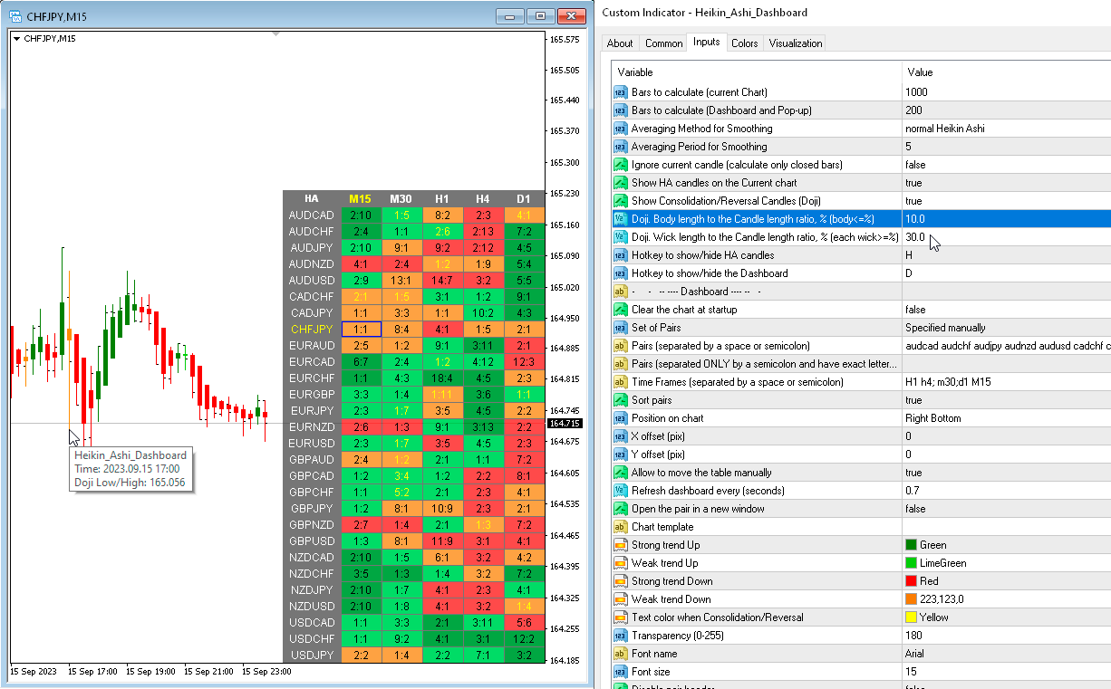 1) Added parameters for Doji calculation: "Doji. Body length to the Candle length ratio, % (body<=%)" and "Doji. Wick length to the Candle length ratio, % (each wick>=%)".