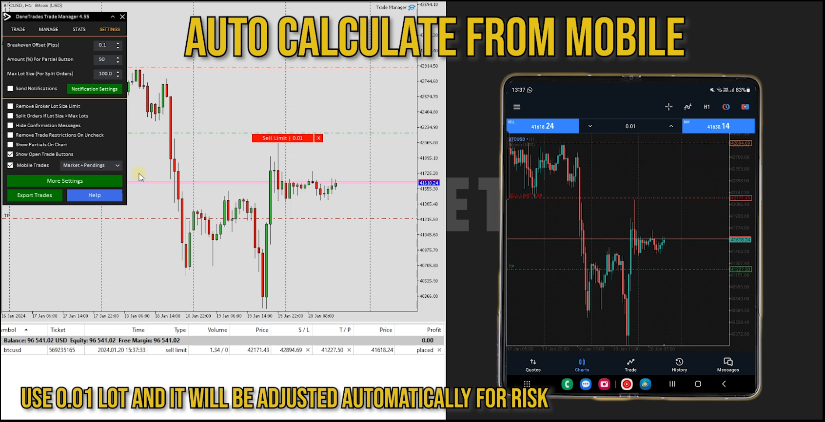 When enabled, if you enter a trade at the minimum lot size (Normally 0.01 lots) the trade will be replaced with an identical one with the risk calculated automatically enabling you to quickly enter from your phone.