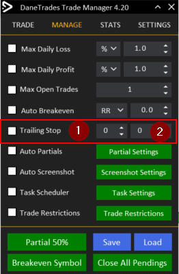 1. First box is now the amount of Pips price has to move in profit before trailing stop is activated