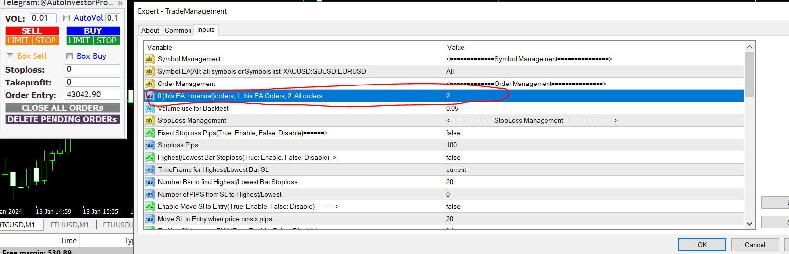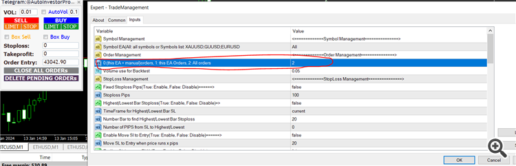 To manage all orders from other EAs, you can set the value = 2 as shown below