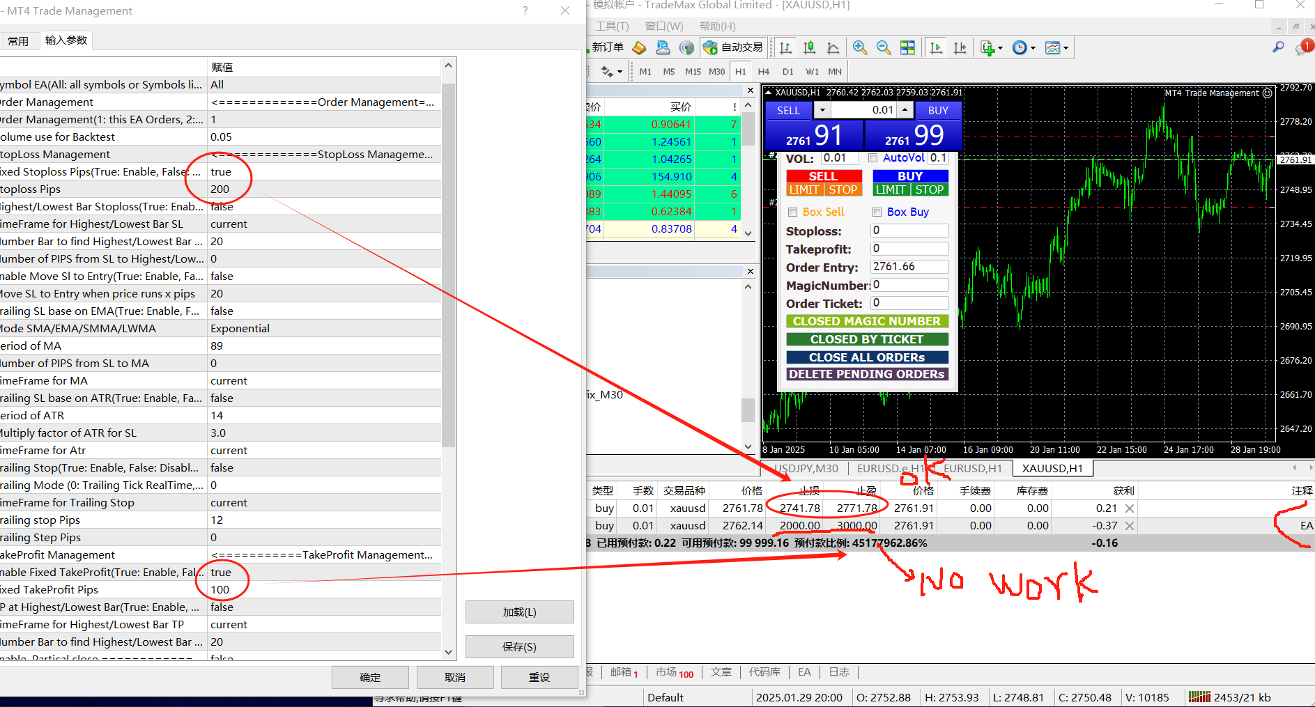 Hi Xiong, I got your point, currently, Ea don't support close orders from other EA. Or you can change Magic Number of your EA is 0. So MT4 Trade Management can close with magic number 0. Normally people don't want to manage orders that affect other ea, so I don't add the feature to close all orders of other ea. I will update the new version for this feature this weekend, then you can update