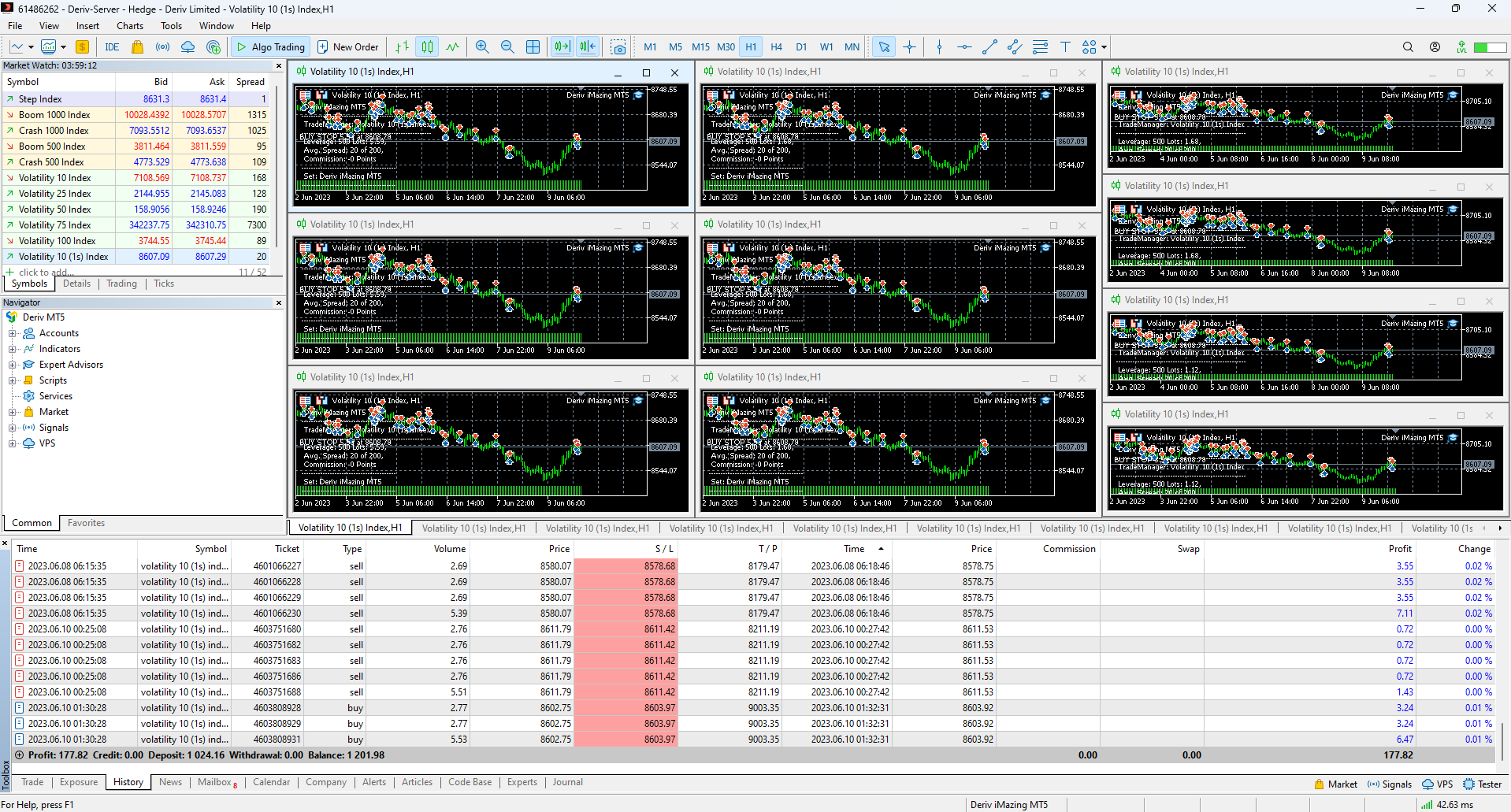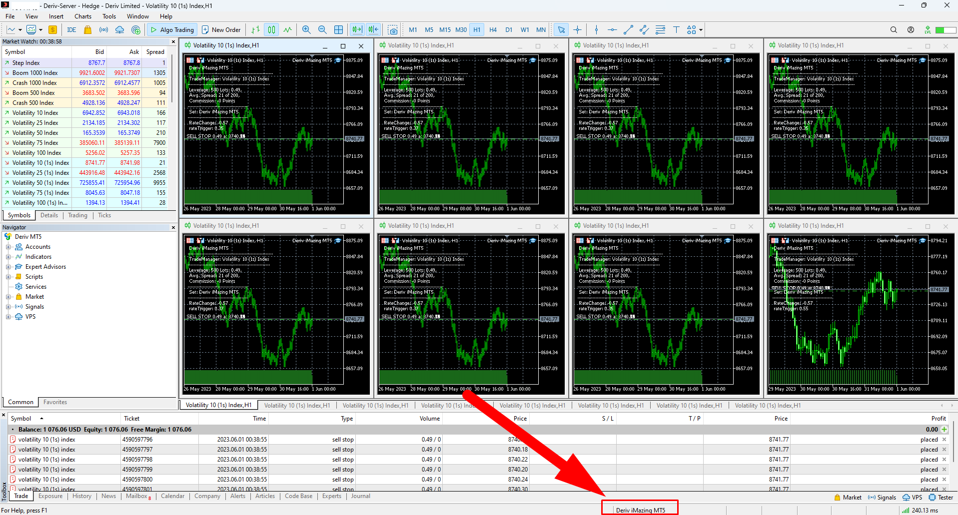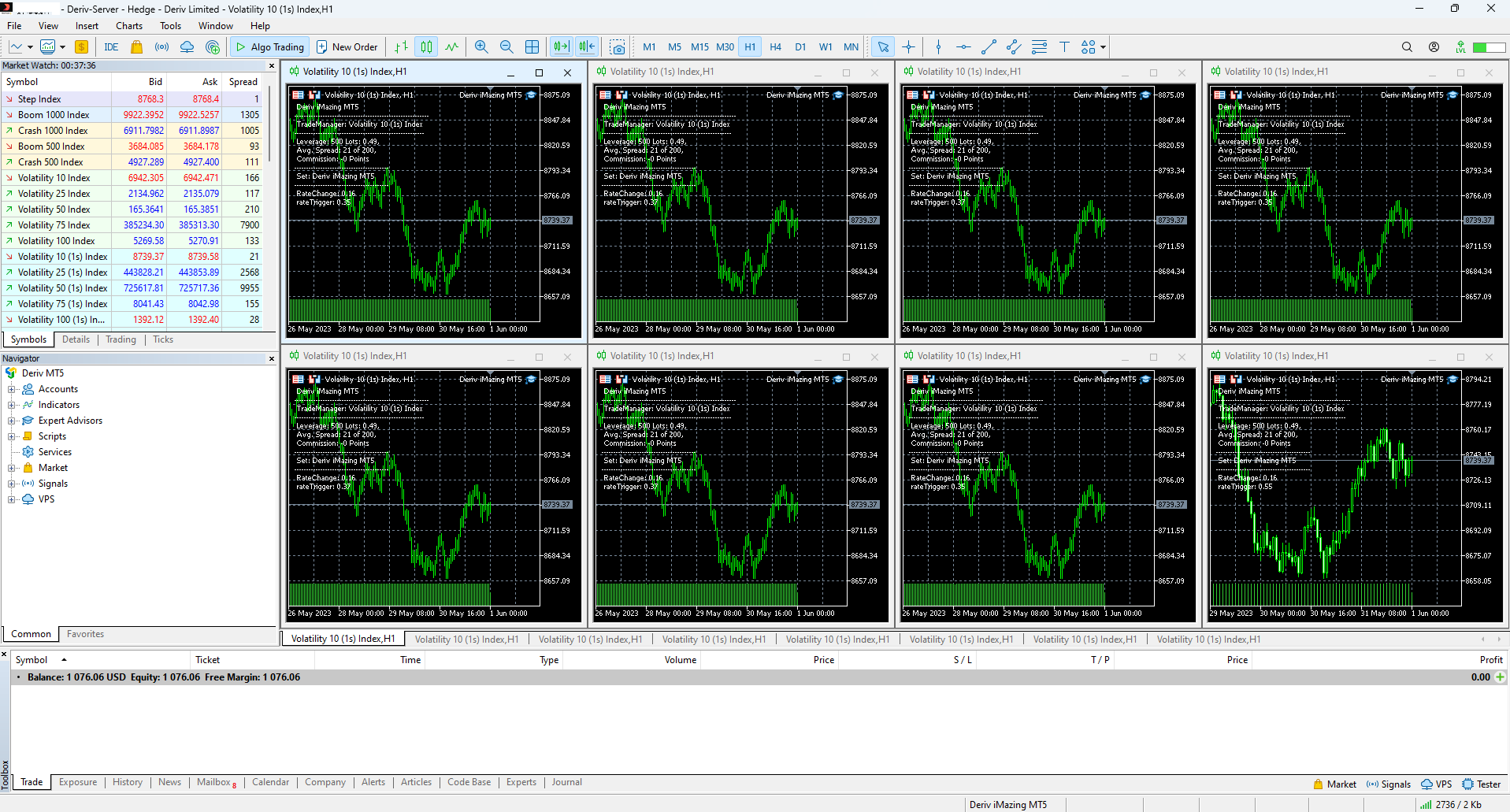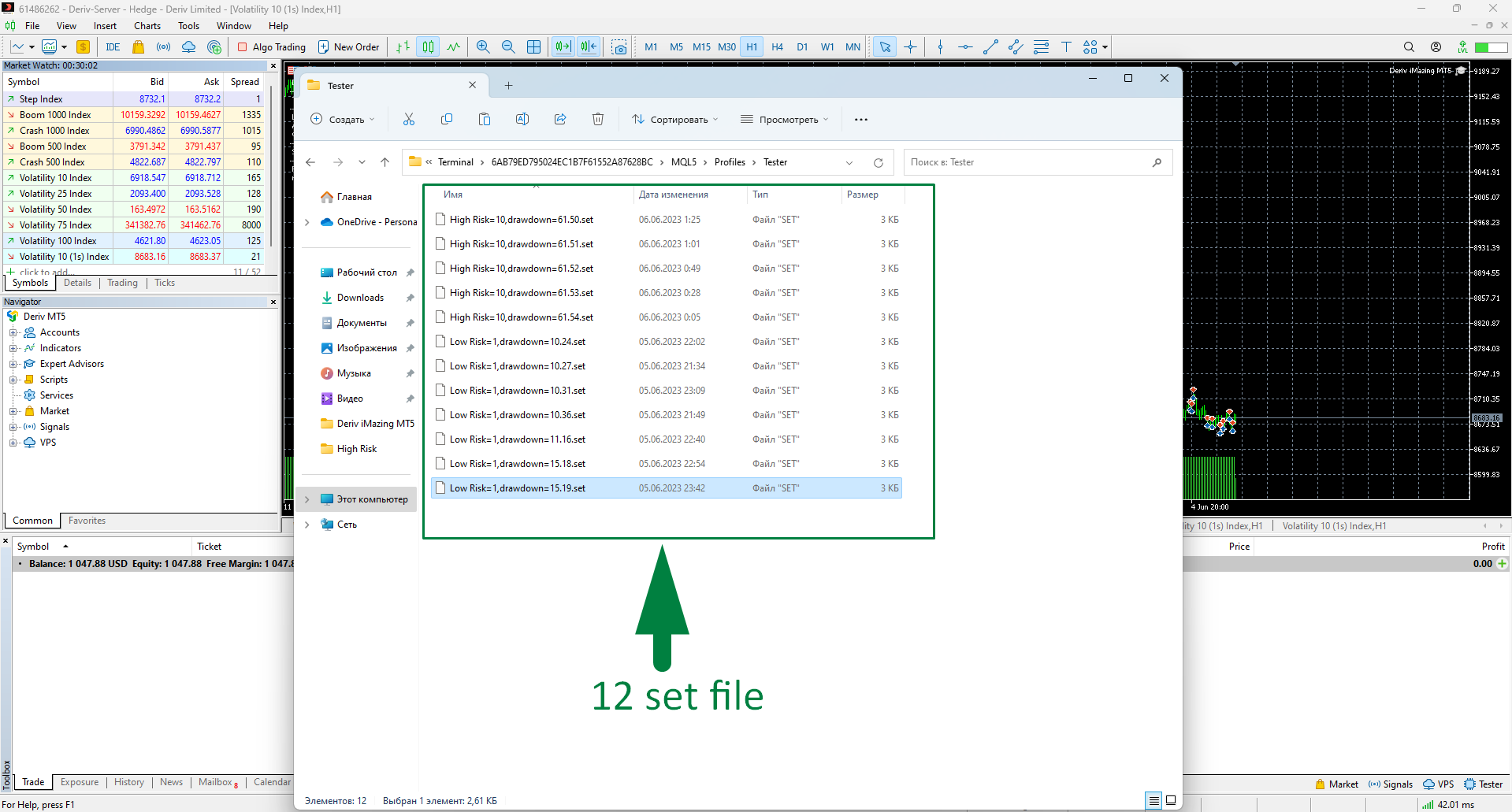 1.You can run all set files on one chart, and at the same time open ( 8 ) windows for trading with the instrument,(Volatility 10 (1s) Index),with a minimum (Risk = 1).