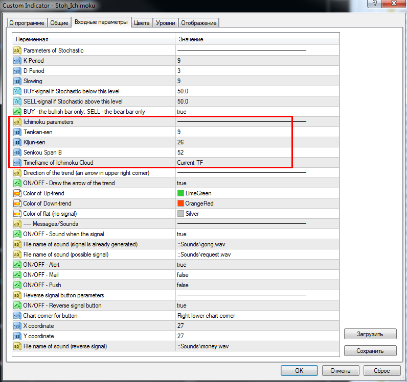 Put on the chart the indicator Ichimoku Kinko Hyo from the standard set of terminal with parameters the same as in the indicator StochasticIchimoku (see figure "stoch_ichi.png").