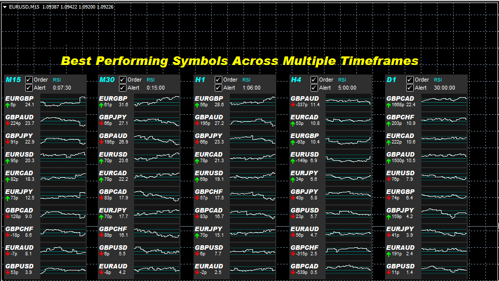 We show the best performing pairs with the ordering, i.e. the strongest will appear higher up the list and the quietest will be lower down. The alert happens when a pair moves up to say top three or top two (configurable). We have an option to display the pips moved already as a percentage of average range. We recommend this so that if it's approaching 100% then know probably 'done for the day' and may not go further. The best pairs are those that have moved up the list yet haven't moved too much in terms pips moved/% of average range (value shown next to the arrow). To get on-board early would be best to use lower timeframe, i.e. 15m or 5m.