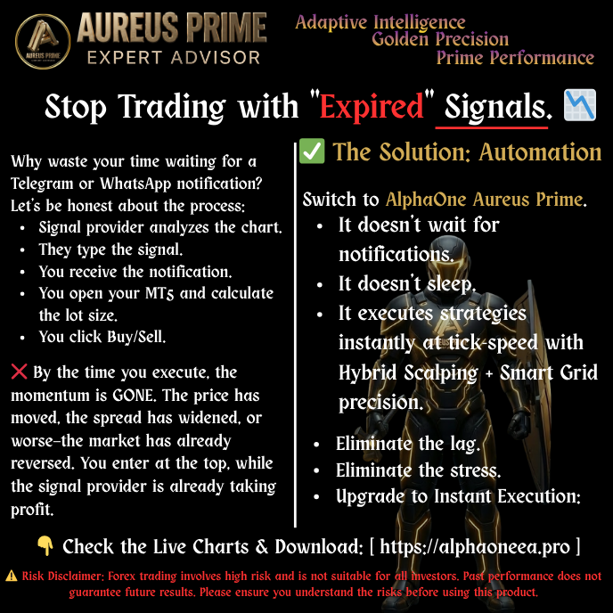 ✅ The Solution: Automation. Switch to AlphaOne Aureus Prime. It doesn't wait for notifications. It doesn't sleep. It executes strategies instantly at tick-speed with Hybrid Scalping + Smart Grid precision.