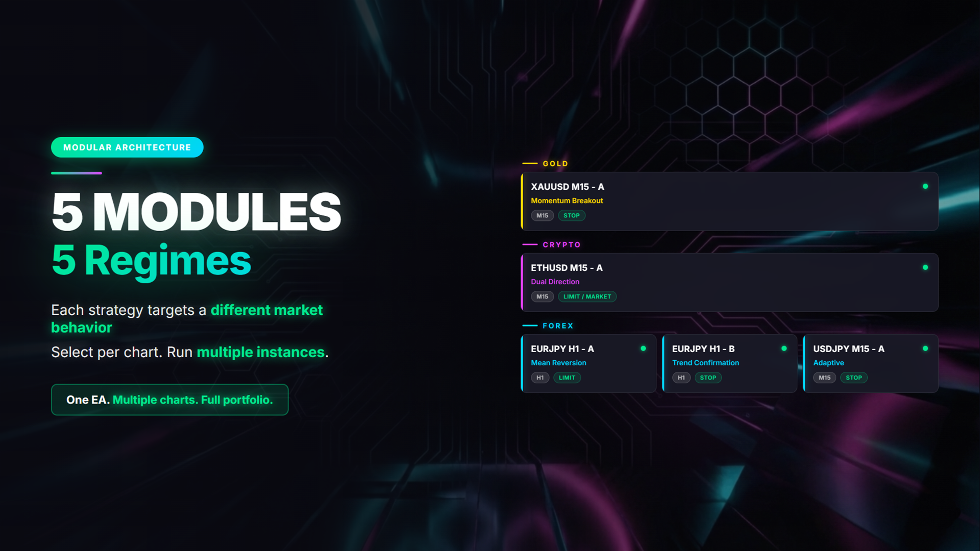 One framework EA that lets you run a portfolio of strategy modules (selectable by enum) across multiple charts — simple to set up, built around the portfolio effect.
