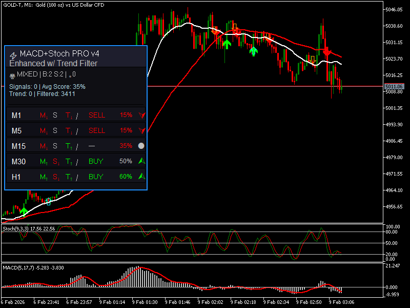 📌 MACD Signal Pro – Çoklu Zaman Dilimi Tarayıcısı MACD Signal Pro, birden fazla zaman diliminde net, filtrelenmiş ve onaylanmış sinyaller isteyen yatırımcılar için tasarlanmış gelişmiş bir göstergedir. Klasik MACD'nin gücünü, modern bir görsel panelde görüntülenen akıllı bir çoklu zaman dilimi tarayıcısıyla birleştirerek yanlış sinyalleri önler ve giriş doğruluğunu artırır. 👉 Forex, Endeksler, Kripto ve Metaller için idealdir. 🚀 ANA ÖZELLİKLER ✅ Hassas AL/SAT Sinyalleri MACD/Sinyal