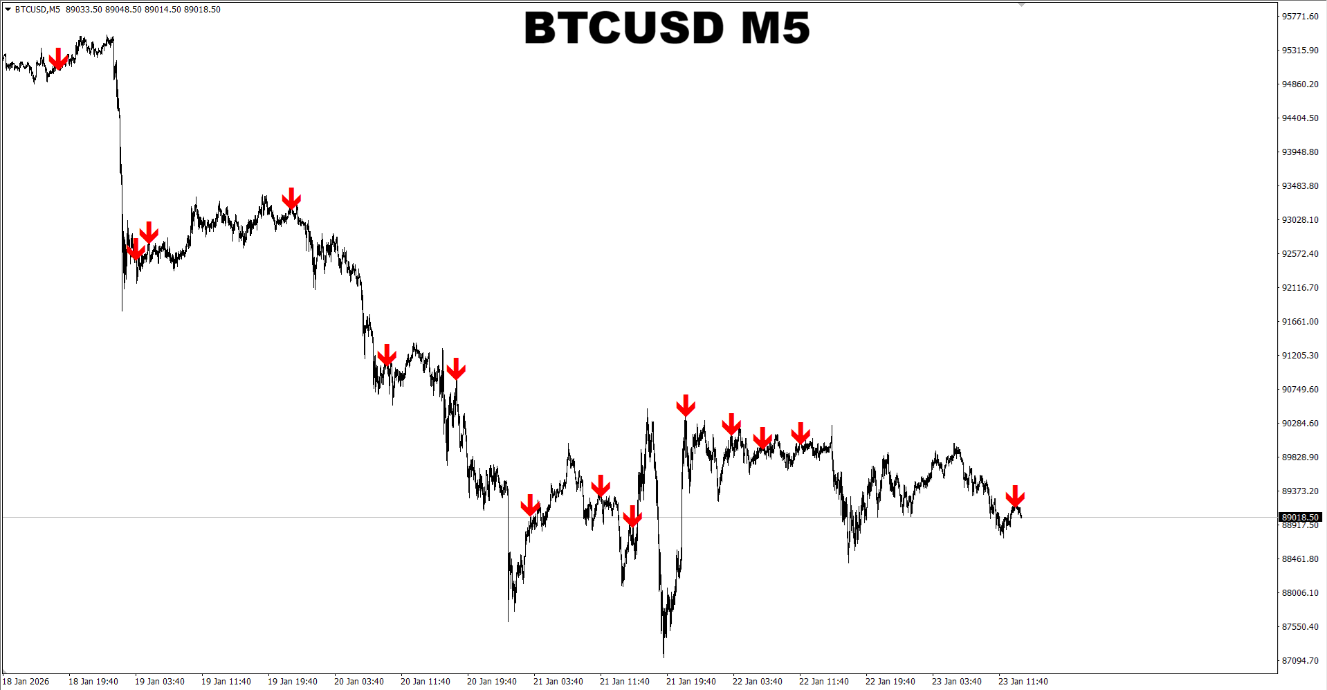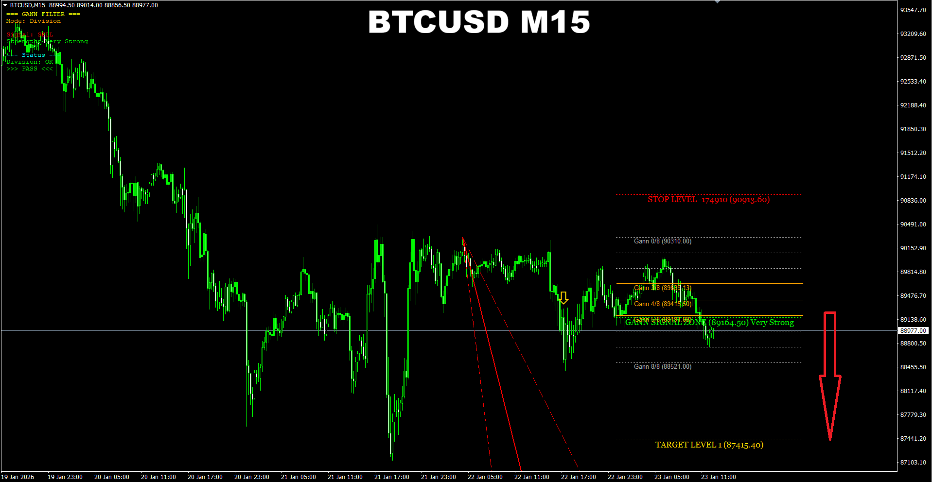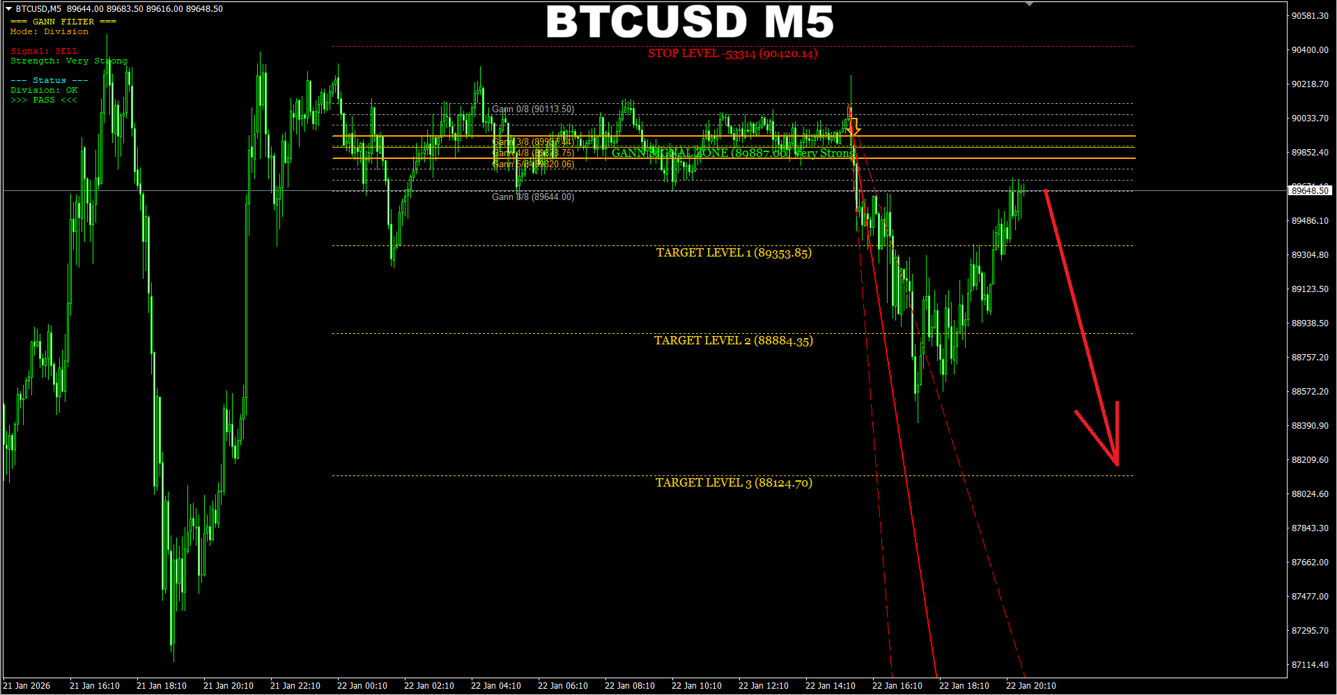 Gann Made Easy. BTCUSD M5. Another update on recent SELL signal. Now there is an opportunity for a new SELL entry in the direction of the same signal. It is recommended to use the SL the indicator provides.