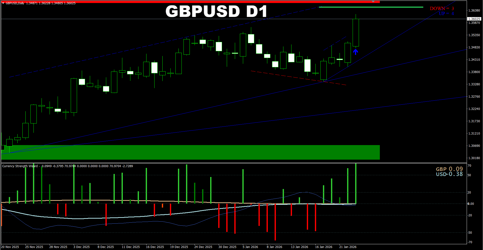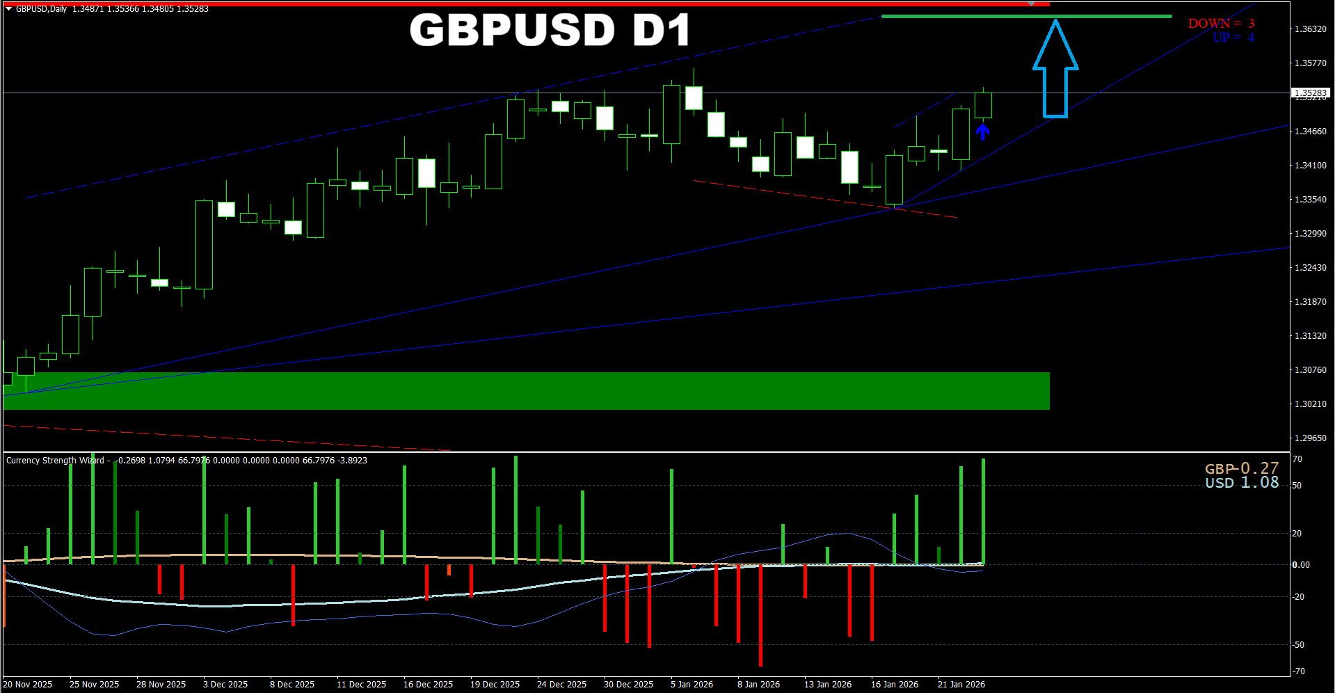 Currency Strength Wizard + Daily Candle Predictor. GBPUSD D1. Another update on current market. As it was predicted earlier, the price is heading towards the earlier predicted area.
