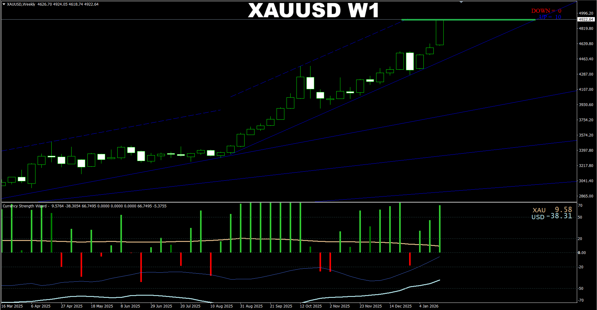Currency Strength Wizard. XAUUSD W1. Another update on current market. Price has approached closely the earlier predicted target and made another new high.