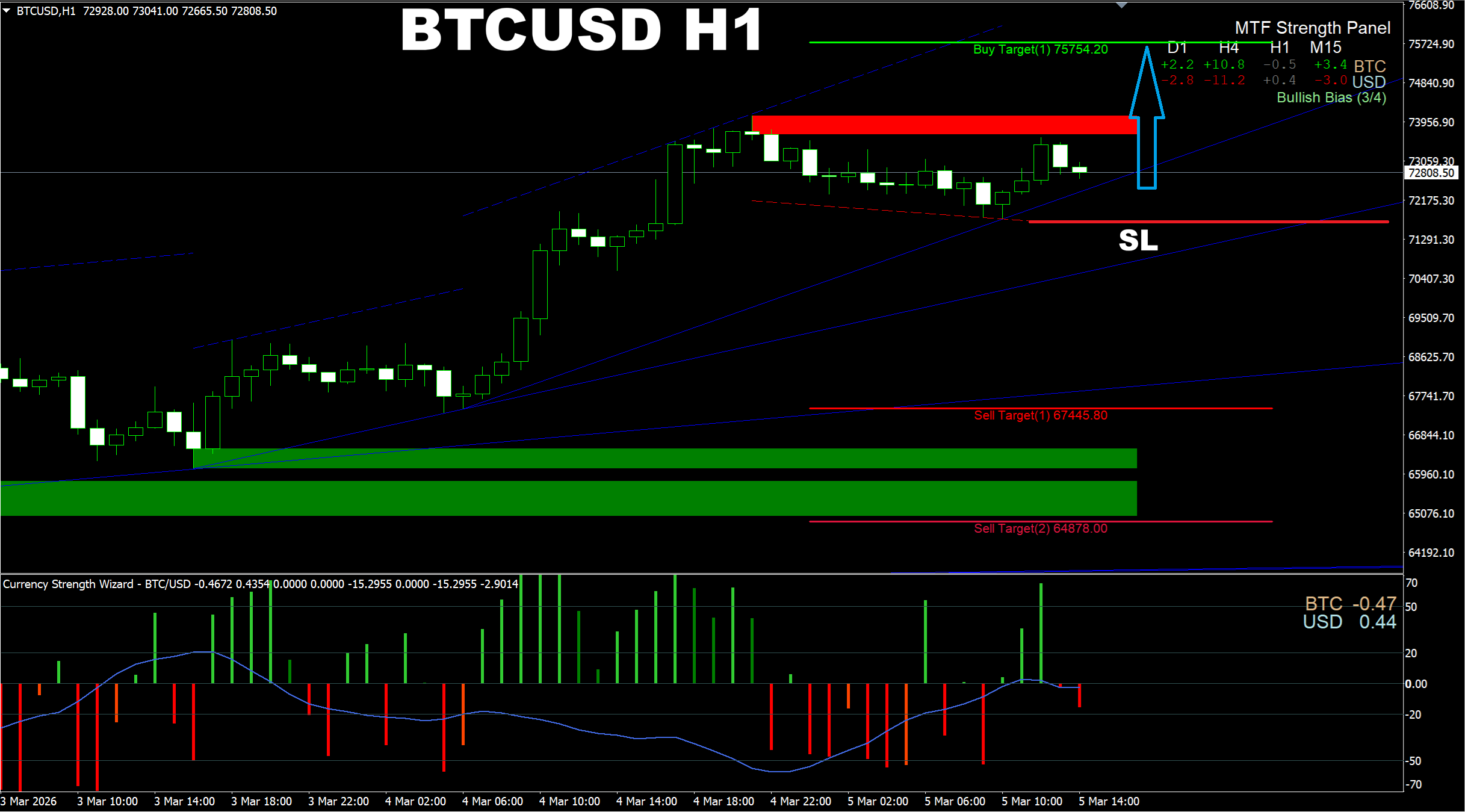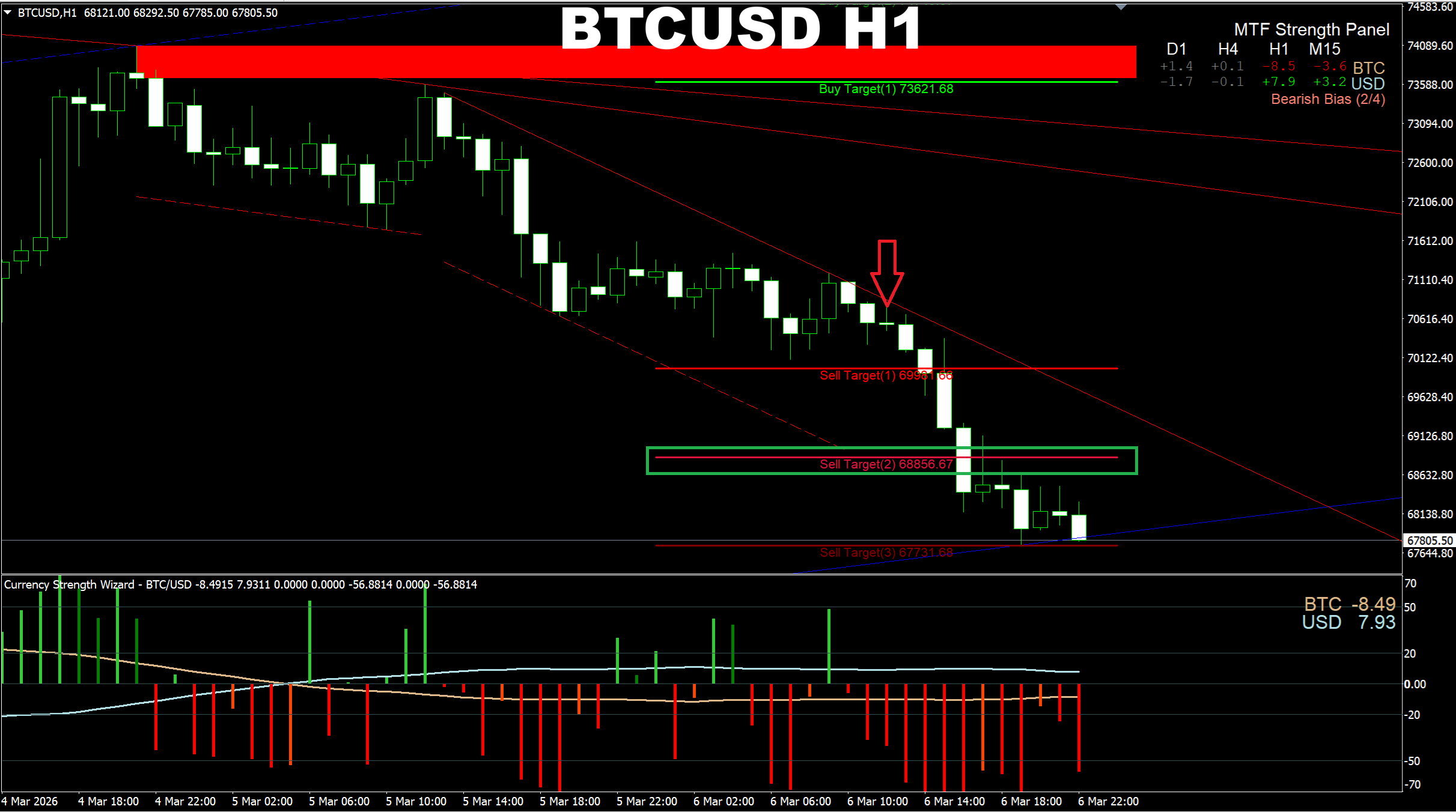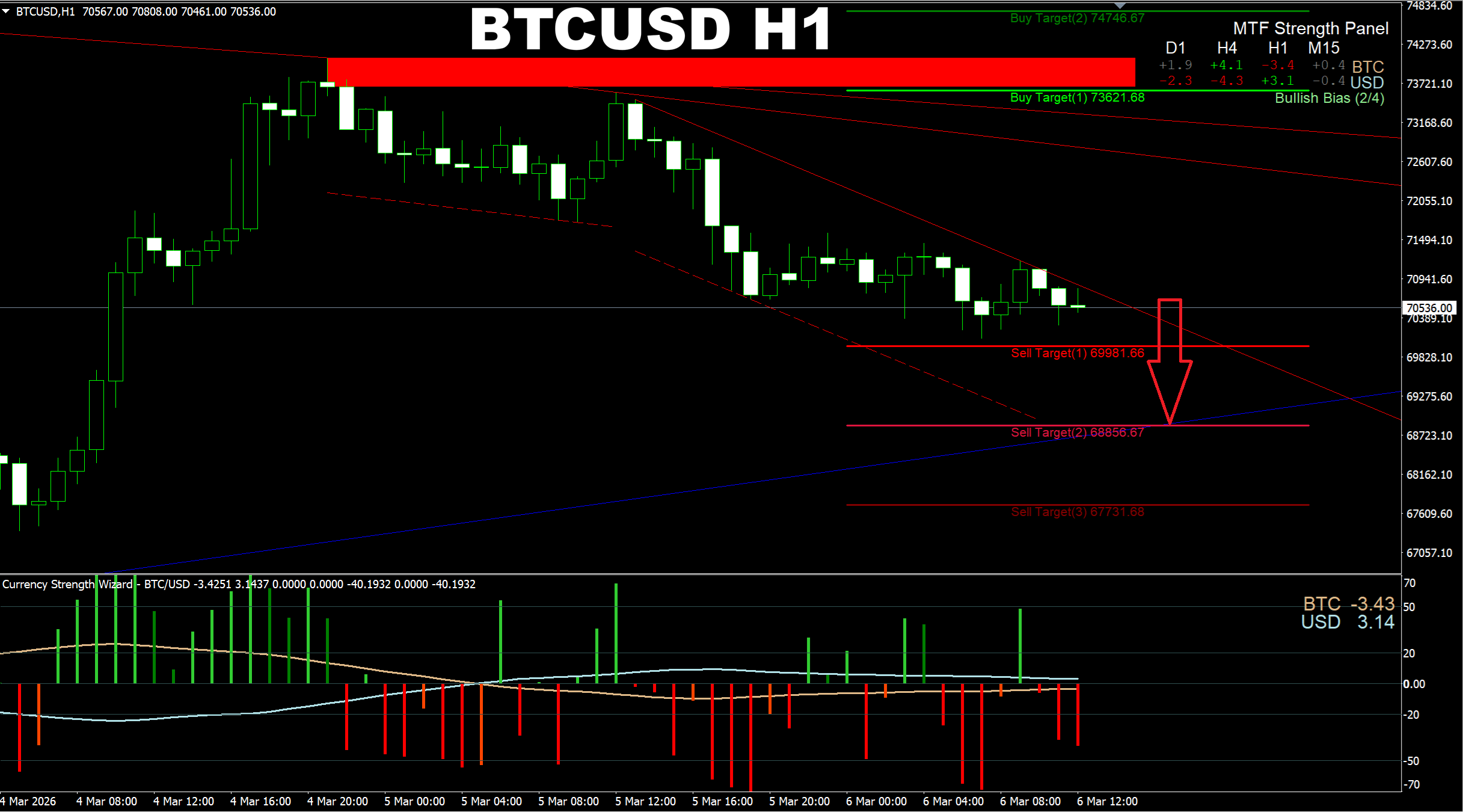 Currency Strength Wizard. BTCUSD H1. Despite the overall bullish bias, the pair may go lower to 68856.67 area as there is short-term selling pressure.