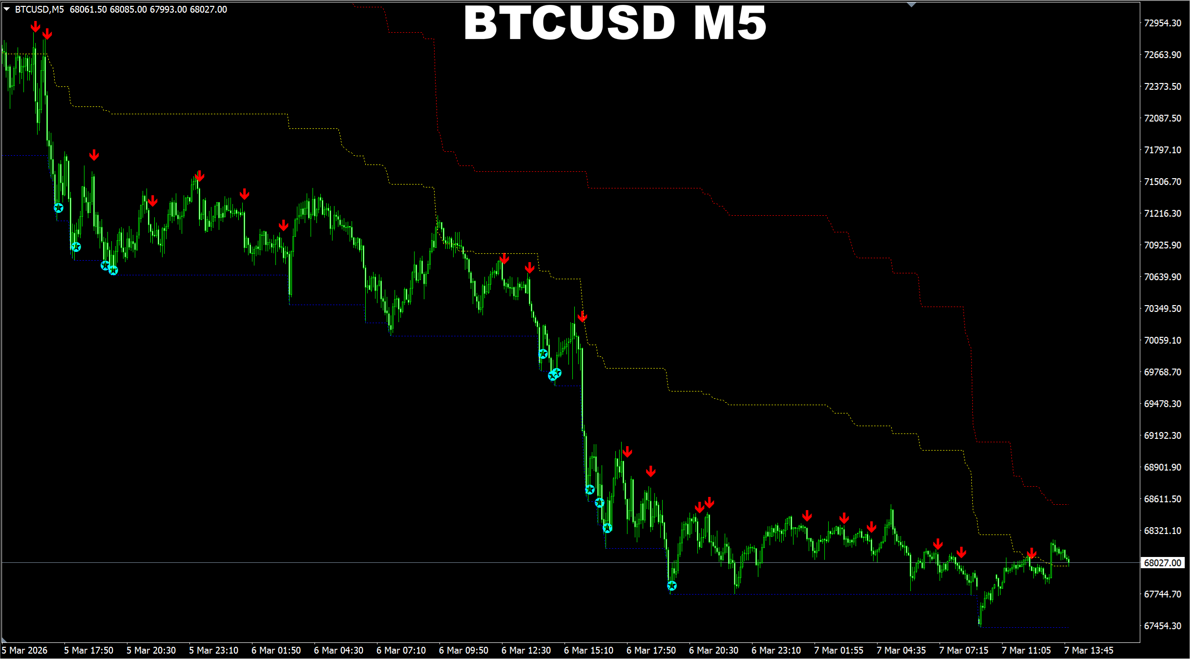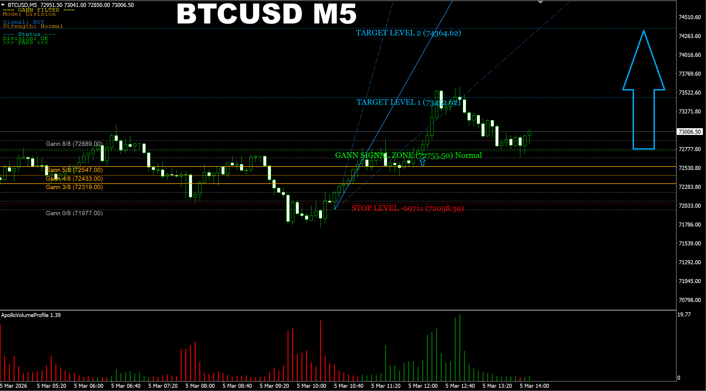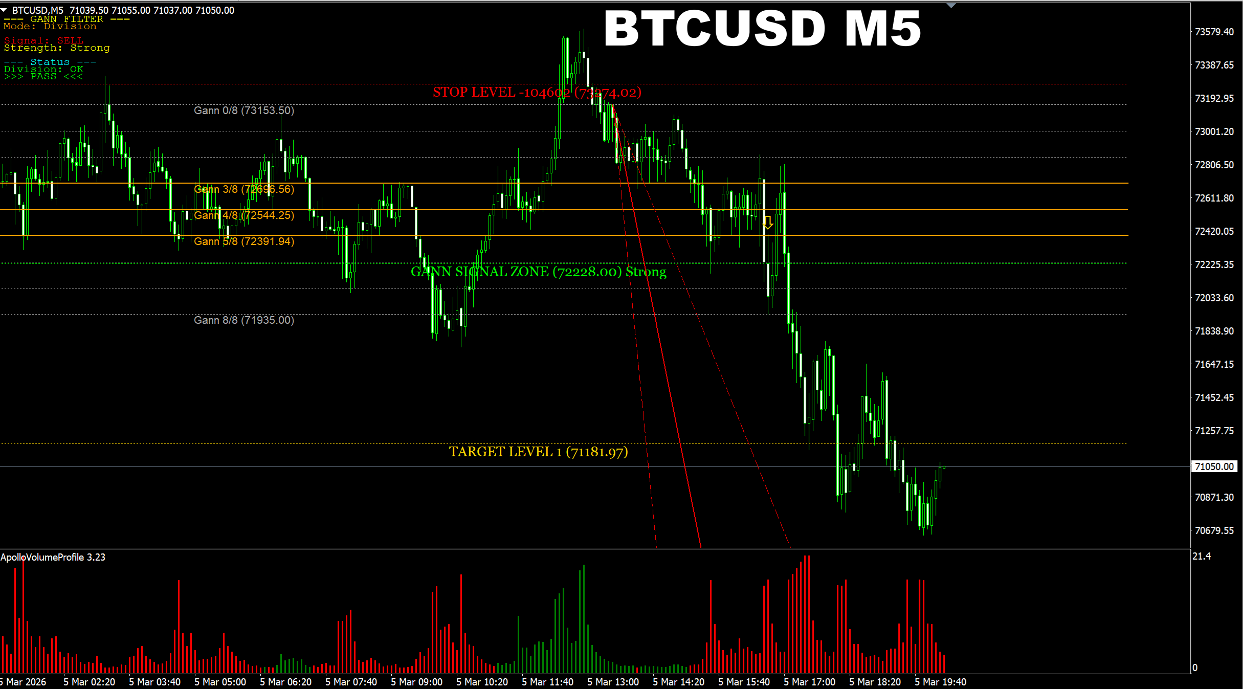 Gann Made Easy. BTCUSD M5. Another update on current market. Market has changed direction for SELL and current SELL signal has already reached the main target. But it looks like current move is just a pullback which is happening on higher time frames.