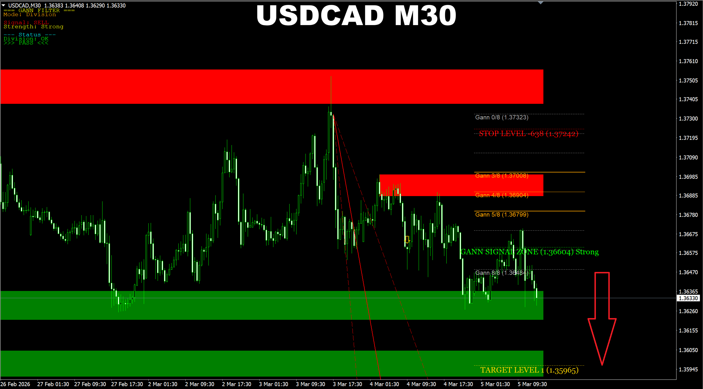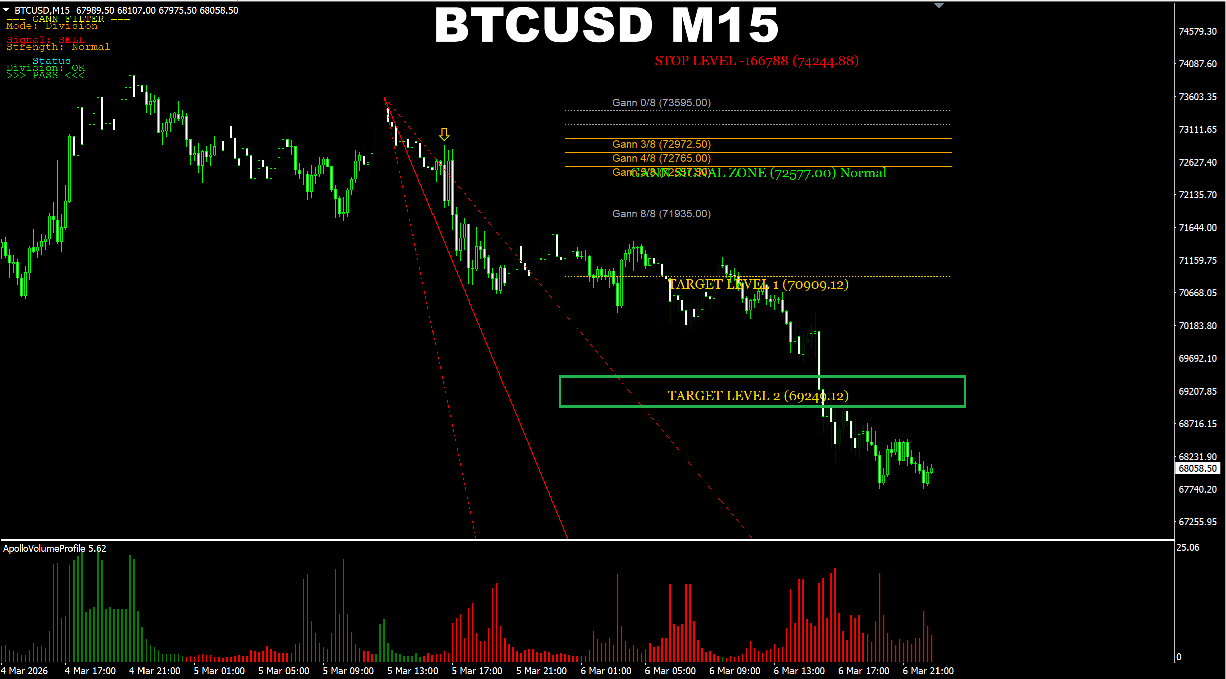 Gann Made Easy. BTCUSD M15. Update on the recent SELL signal progress. Price has reached the earlier predicted target.