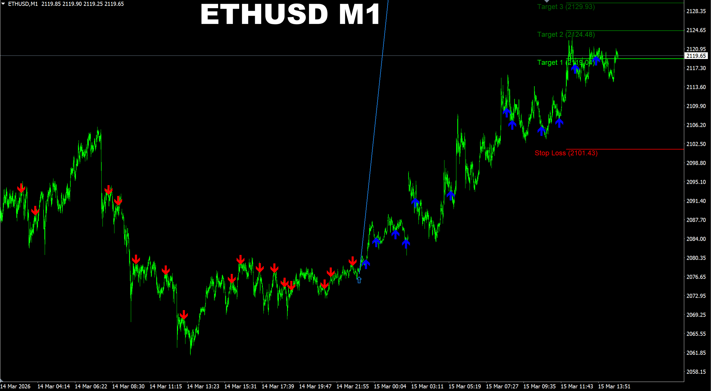 Scalper Vault. XAUUSD D1. Default settings. Recent signals performance. Easy way to trade. You just trade in the direction of the last signal using the lowest and highest BUY and SELL zone levels (last opposite lines as TP and SL depending on the signal direction). In current market example the trade direction of the last signal is BUY. The lowest red level is the SL and the highest blue level is the TP. It is also possible to use partial TP based on the level the price is trading at.