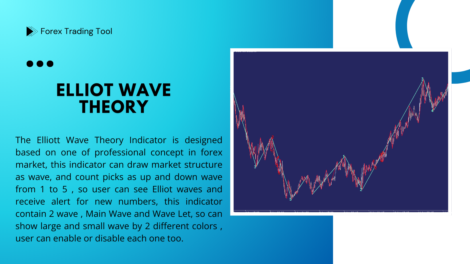 Indicatore della Teoria delle Onde di Elliott per MetaTrader 4 L'indicatore della Teoria delle Onde di Elliott è progettato basandosi su uno dei concetti professionali del mercato Forex. Questo indicatore traccia la struttura del mercato sotto forma di onde e conta i picchi come onde rialziste e ribassiste da 1 a 5. Gli utenti possono visualizzare facilmente le onde e ricevere notifiche ogni volta che viene generato un nuovo numero. Supporta due tipi di onde: onde principali e onde secondarie