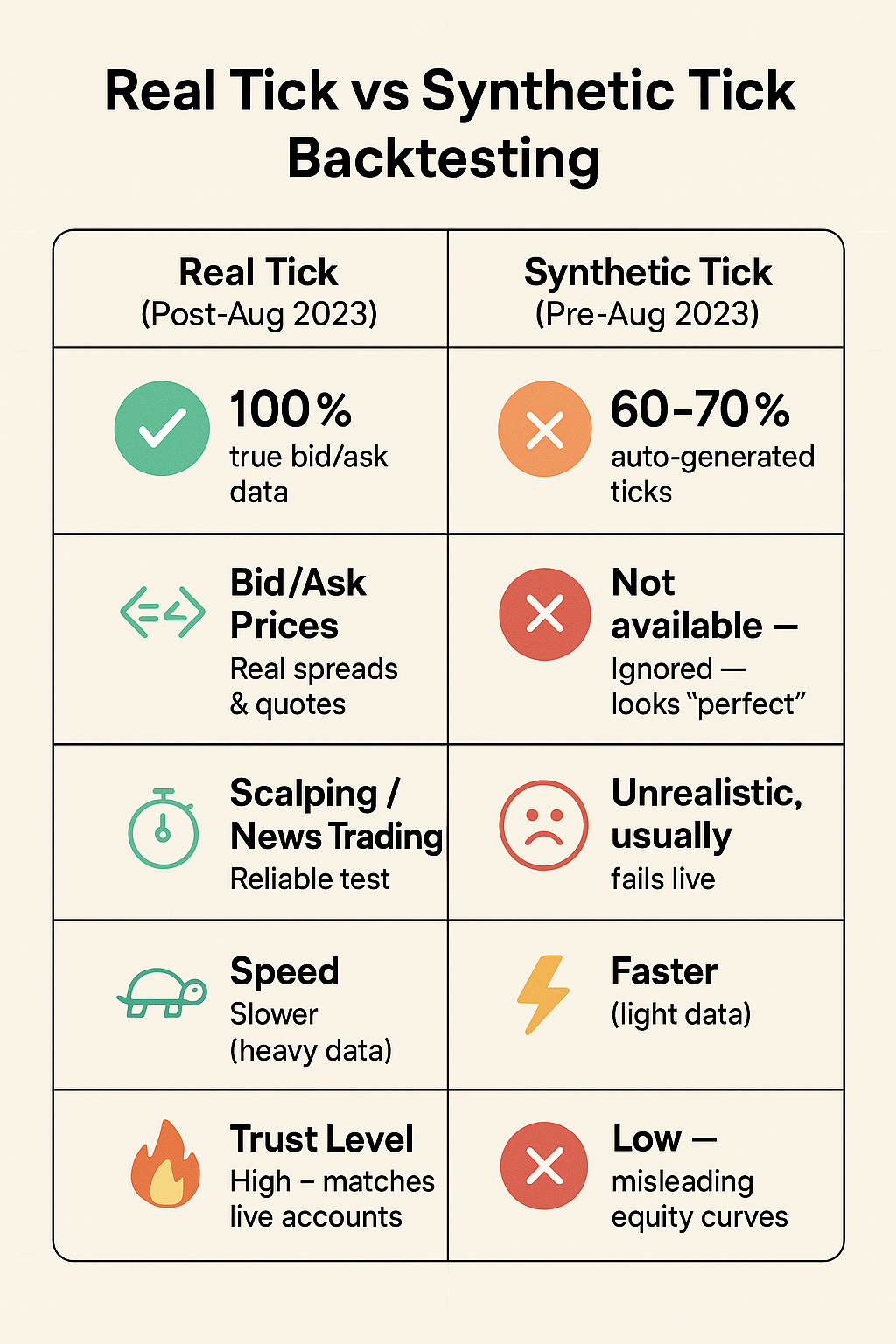 That means only the last 2 years offer truly accurate data with real-time bid and ask prices, spreads, and execution lags — the very things that affect real trades.