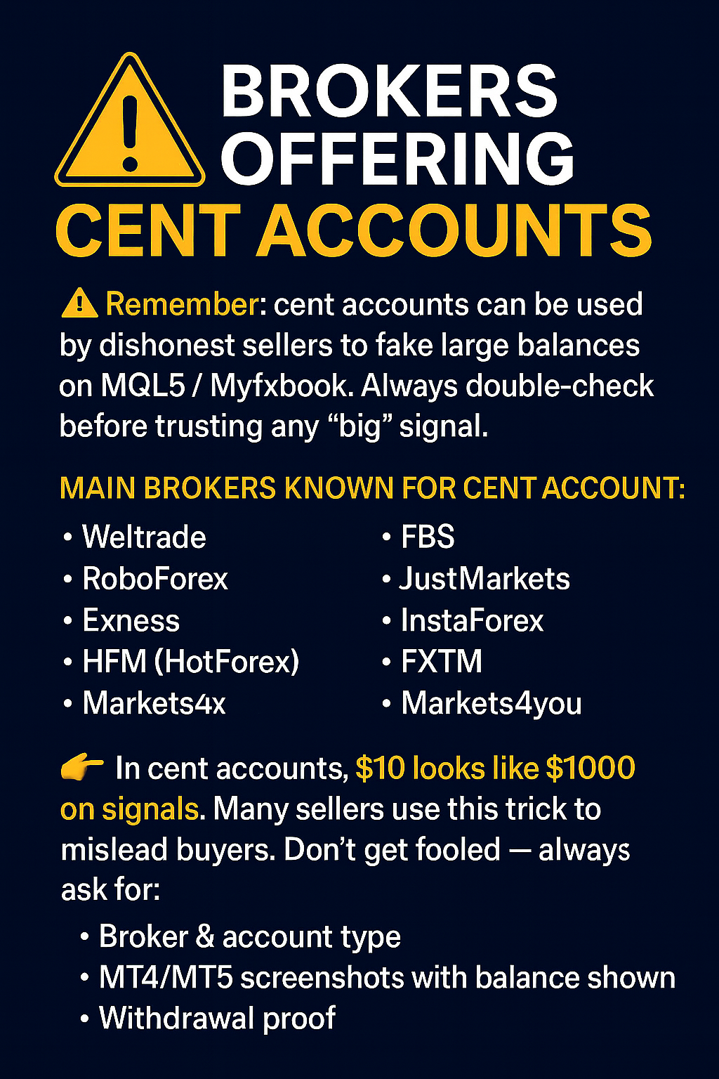 👉 In cent accounts, $10 looks like $1000 on signals. Many sellers use this trick to mislead buyers. Don’t get fooled — always ask for:
