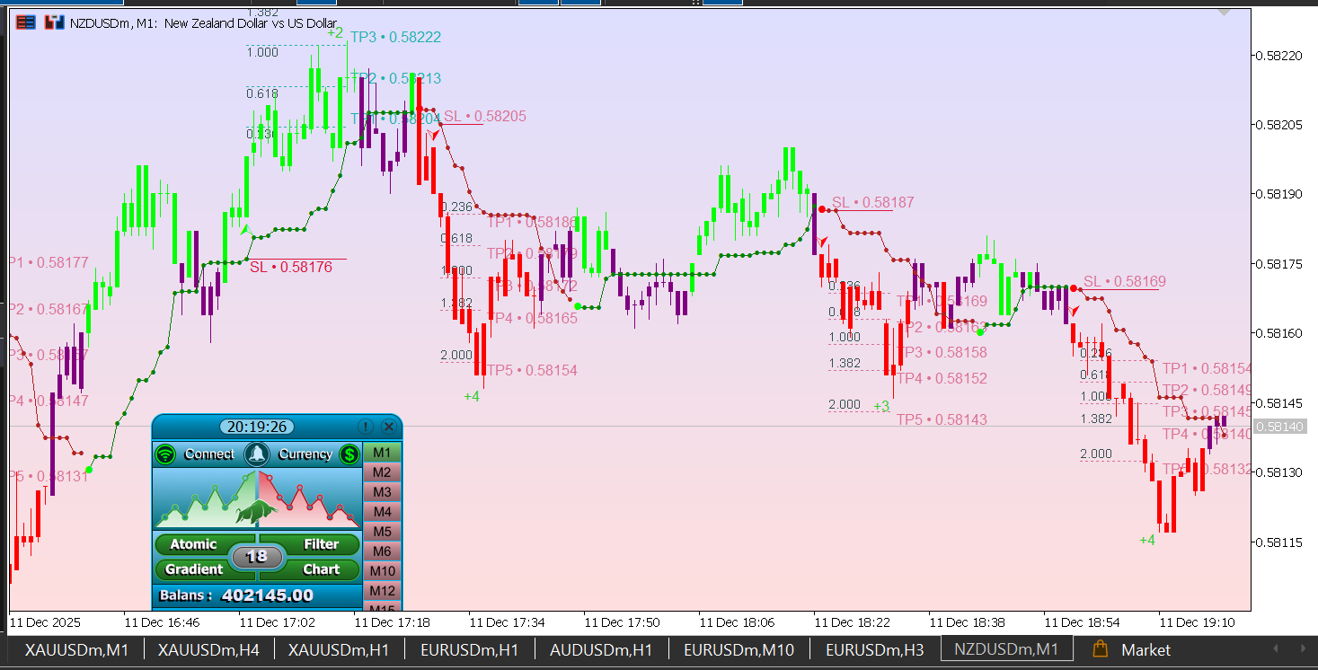 Catch both trends and potential reversals with live alerts, all laid out in a visual style that works on major pairs like EURUSD, AUDUSD, XAUUSD in timeframes M5-H1.