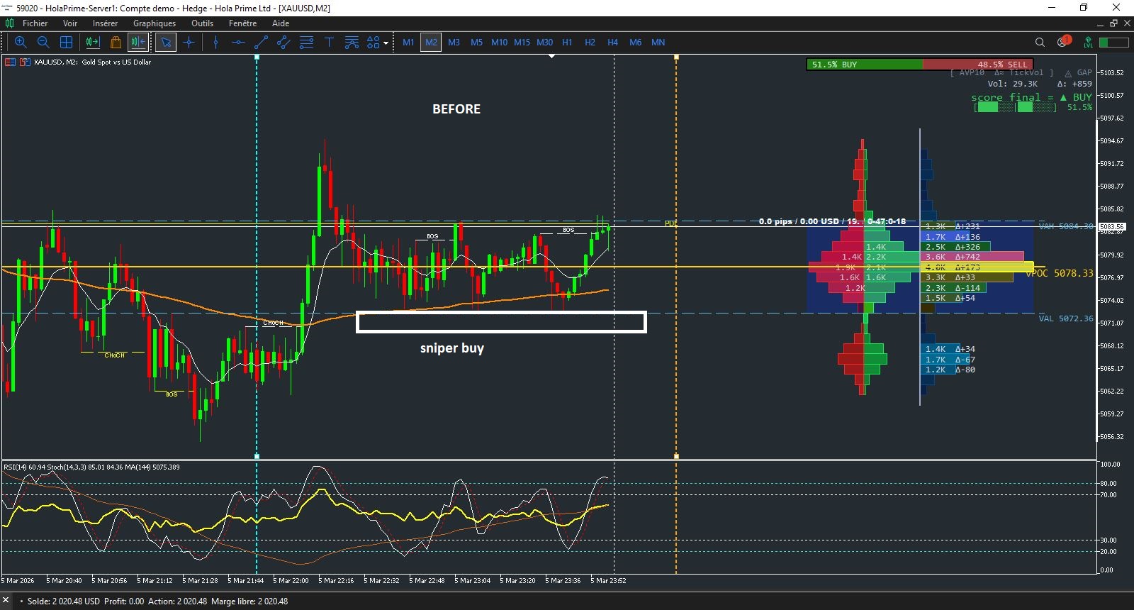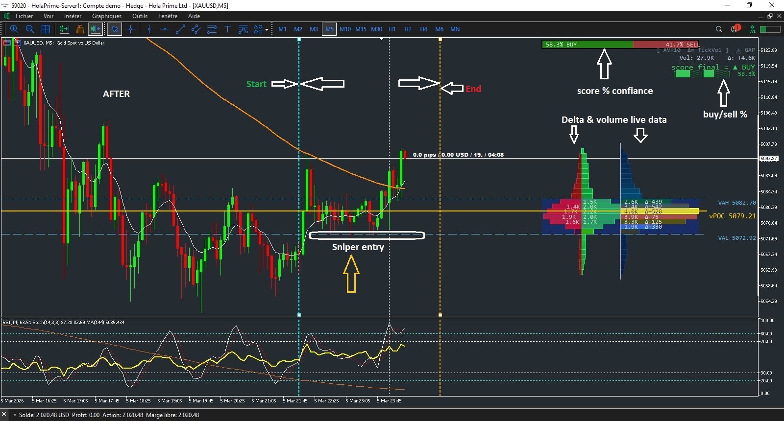 AnchorFlow Pro — Anchored Volume Profile & Delta ───────────────────────────────────────────── WHAT IS IT? ───────────────────────────────────────────── AnchorFlow Pro is a professional Anchored Volume Profile indicator for MetaTrader 5. It shows the exact volume distribution between any two points you choose on the chart, combined with a Buy/Sell Delta split panel — giving you an institutional-quality order flow view without leaving MT5. Simply drag two vertical