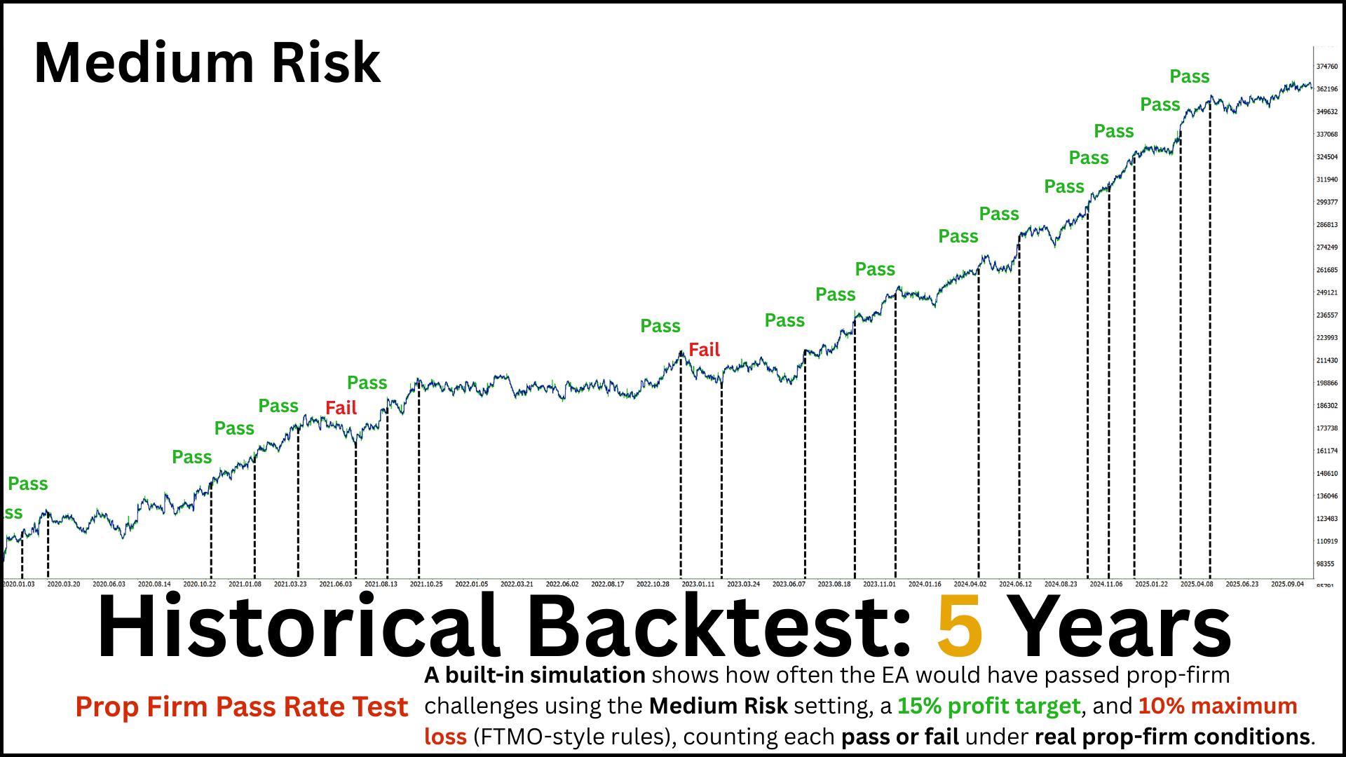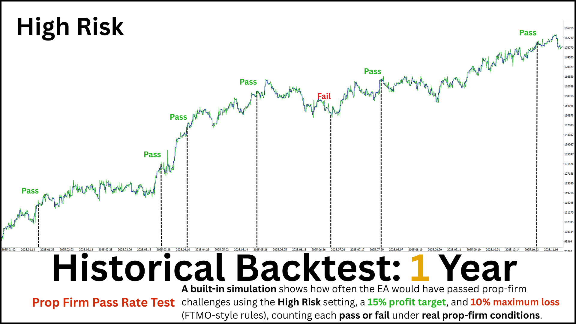 - This repeats across the entire test period, just like real prop-firm challenges