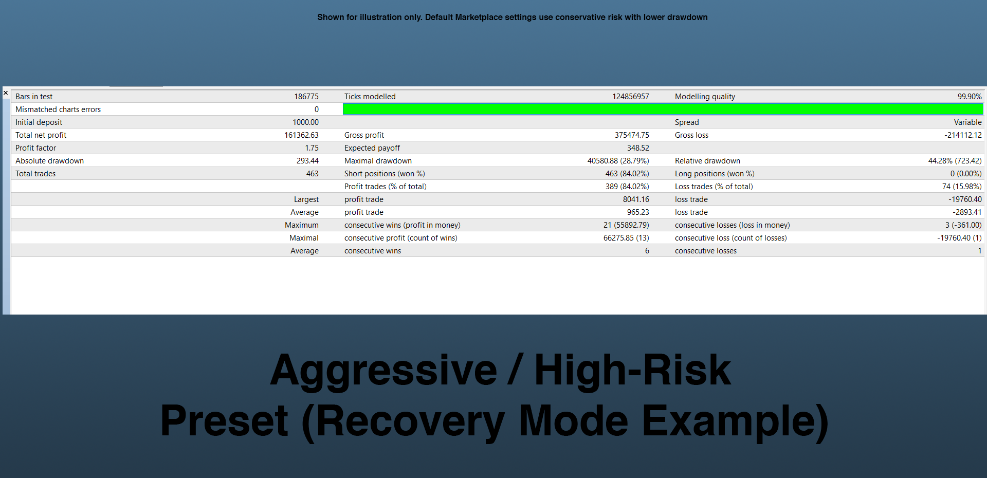 The purpose of this configuration is to illustrate how the strategy behaves under elevated risk conditions, including recovery logic and dynamic position sizing.